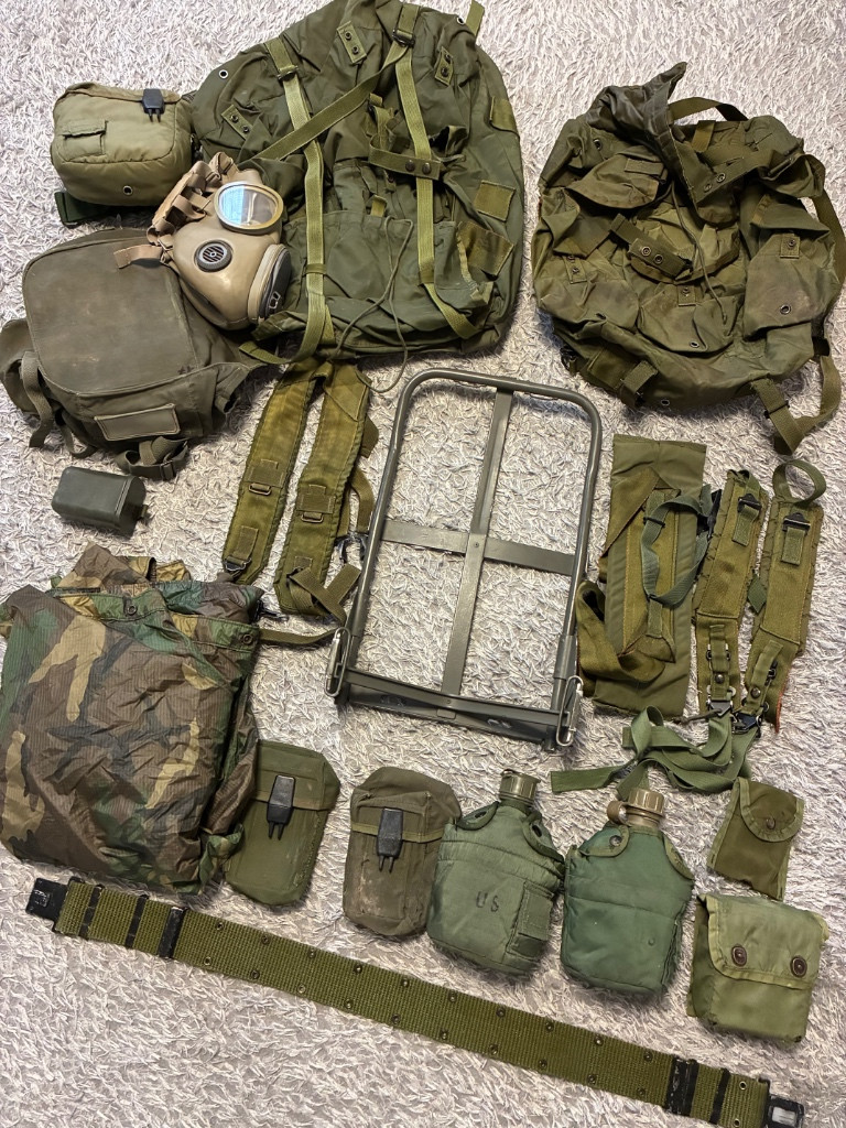 ALICE set. Stav různý, poncho horší stav. Obsahuje: Batoh ALICE M+L vak, kostru, popruhy a bederak Webbing 2xM16, 2x canteem, psanicko, lekarna, opasek, Y Obal na masku s OM10 a krabicka 2Q lahev s obalem a popruhem Poncho woodland