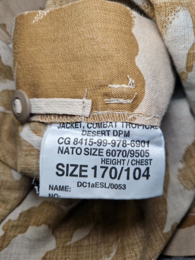 Blůza/košile lehká bojová, pouštní maskování DPM – Velká Británie Velikost: 170/104 (výška/obvod hrudníku) Nová, nepoužitá, dlouhodobě skladovaný kus. Zapínání na knoflíky, 2 velké šikmé kapsy na hrudníku, nášivka na levé paži. Kód výstrojní součástky: CG-8405-99-978-6901 Pro jakékoliv dotazy mne kontaktujte, obratem Vám odpovím.