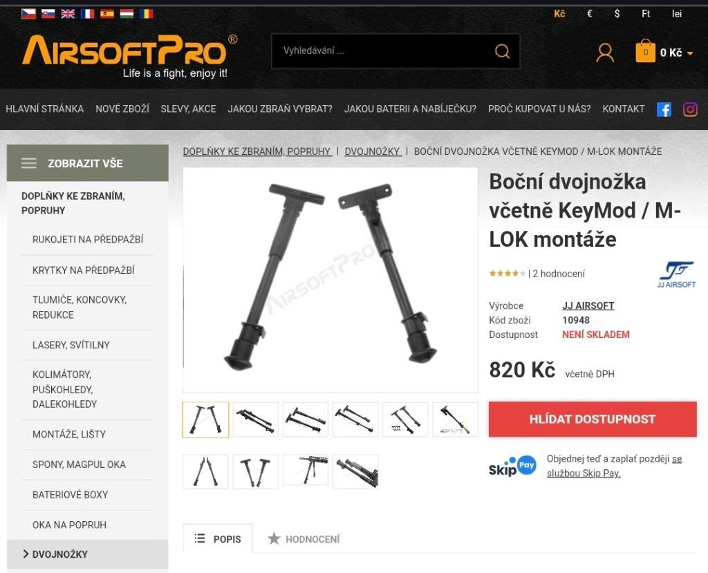 Dobrý den. Prodávám boční dvojnožka včetně keymod/m-lok montáže. Lehce použité. Cena 500 kč. Osobní předání v Praze Modřanech. Nebo zašlu zásilkovnu za 89 kč při platbě předem.