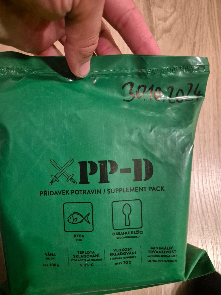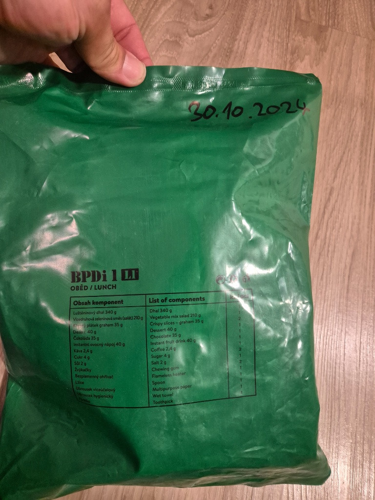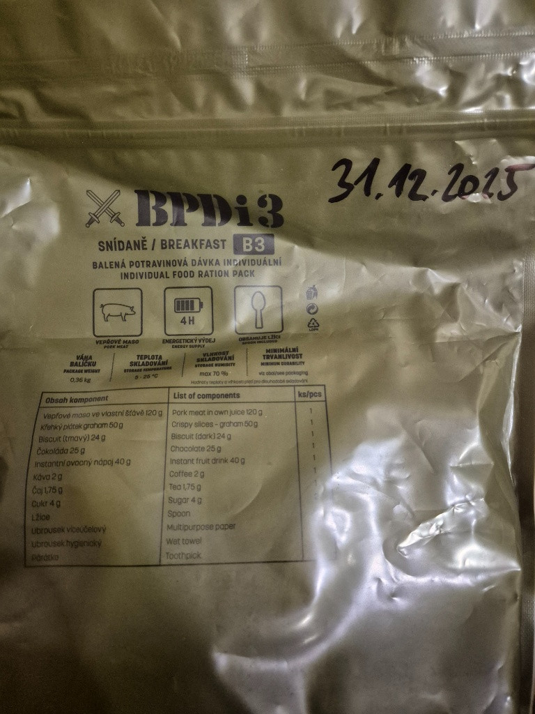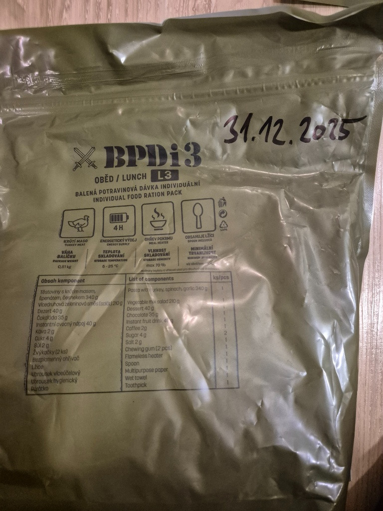 Bojové potravinové dávky viz foto. Ideální balíčky na cesty a do přírody. Cena za všechny. Minimální trvanlivost viz foto nebo níže. 1 x BPDi3-L3 - 31.12.2025; 1 x BPDi3-B3 - 31.12.2025; 1 x BPDi2-B2 - 31.12.2025; 1 x BPDi1-L1 - 31.12.2025; 1 x BPDi4-D4 - 31.12.2025; 1 x PP-D - 31.12.2025; 2 x PP-C - 31.12.2025; 1 x BPDi6-DD6 - 31.7.2025; 1 x BPDi1-B1 - 1.6.2025; 2 x PP-D - 1.6.2025; 1 x BPDi1-1.1 - 30.10.2024; 1 x PP-D - 30.10.2024; 1 x MRE-MENU11 - 34 5132