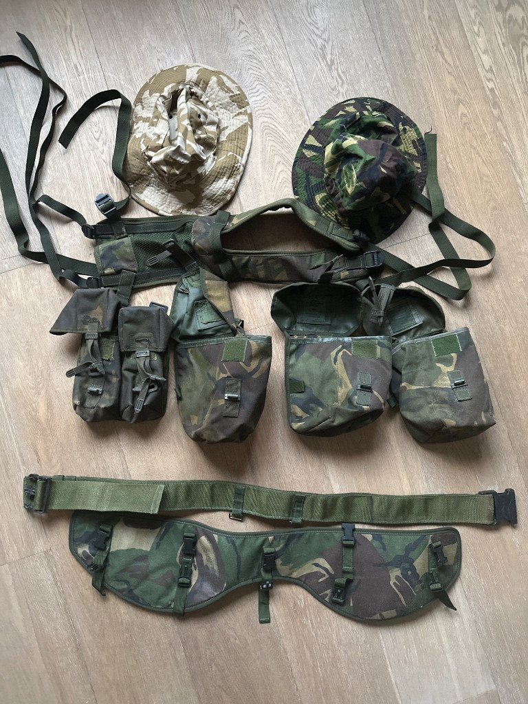 Nabízím k prodeji webbing britské armády. Součástí jsou ramenní tráky, bederní pás, opasek, 1x dvojitá sumka na zásobníky (někde vyhrabu i druhou), water pouch 2x a 1x uzility. Zdarma přidám klobouky - viz foto