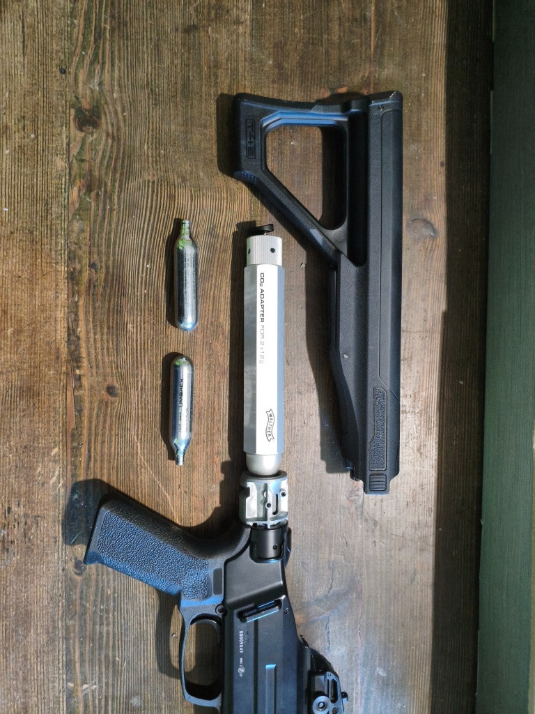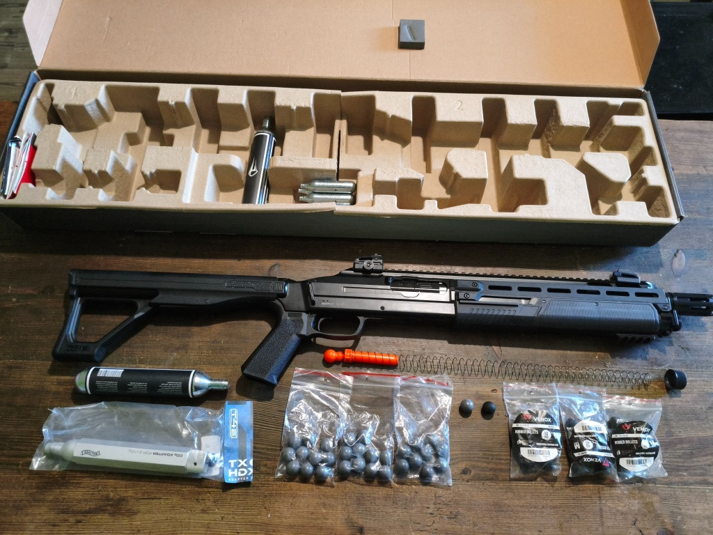 Špičková brokovnice pro obranu majetku, paintball, nebo jen tak pro rekreační střelbu. Parádní zážitek ze střelby umocňuje výkon 40 j .. zbraň je jak nová, bohužel mi prasklo levé poutko pro úchyt řemenu ( není to nic, co by nešlo opravit) , prodávám se vším na fotu. Jako kompenzaci přidám redukci Walther na 12 g bombičky v hodnotě 1100 Kč . Pořizovací cena 13000 Kč.