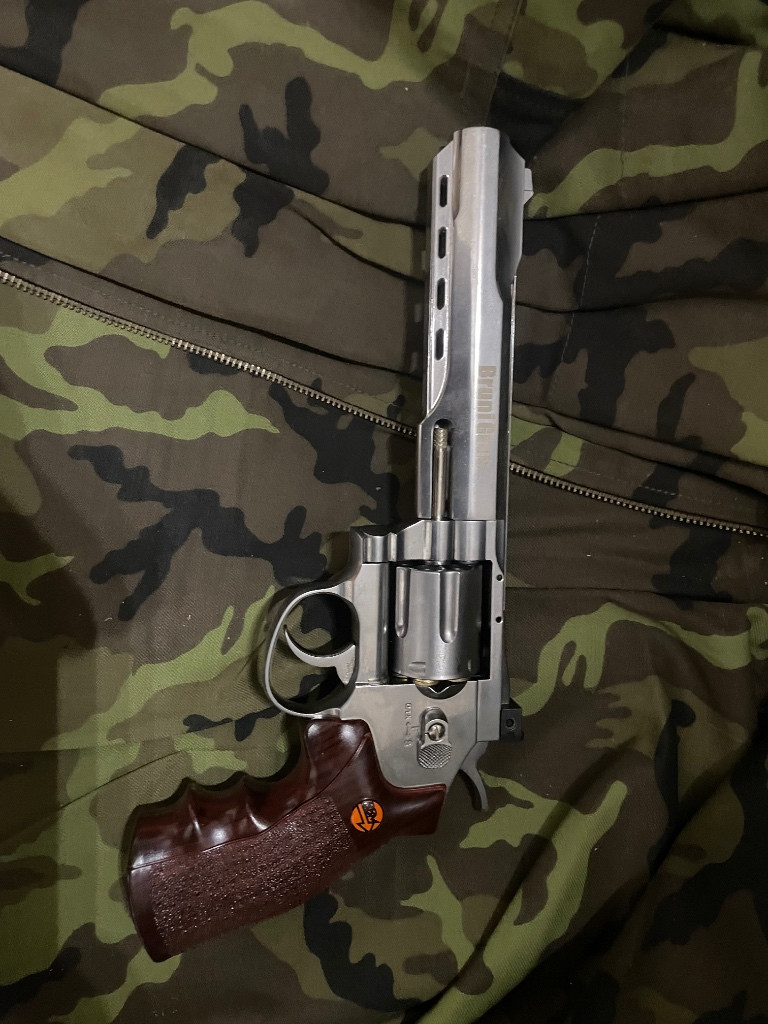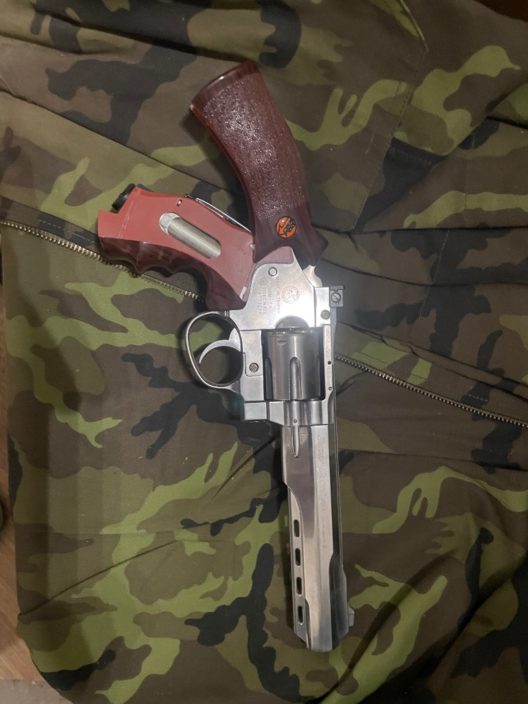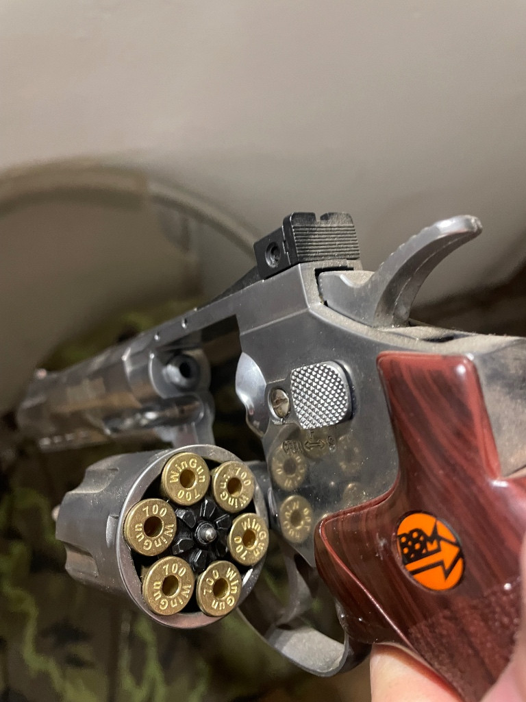 Dobrý den prodám revolver na co2 bombičku .do 3 J Ráže 4,5 mm . Ocelové broky Dlouha 8” hlaveň Zbraň bez ZP Váha 1 040 gramů Součástí jsou dvě montážní listy na optiku atd.6 nábojnic a držák na nábojnice . Úsťová rychlost okolo 120 m/s
