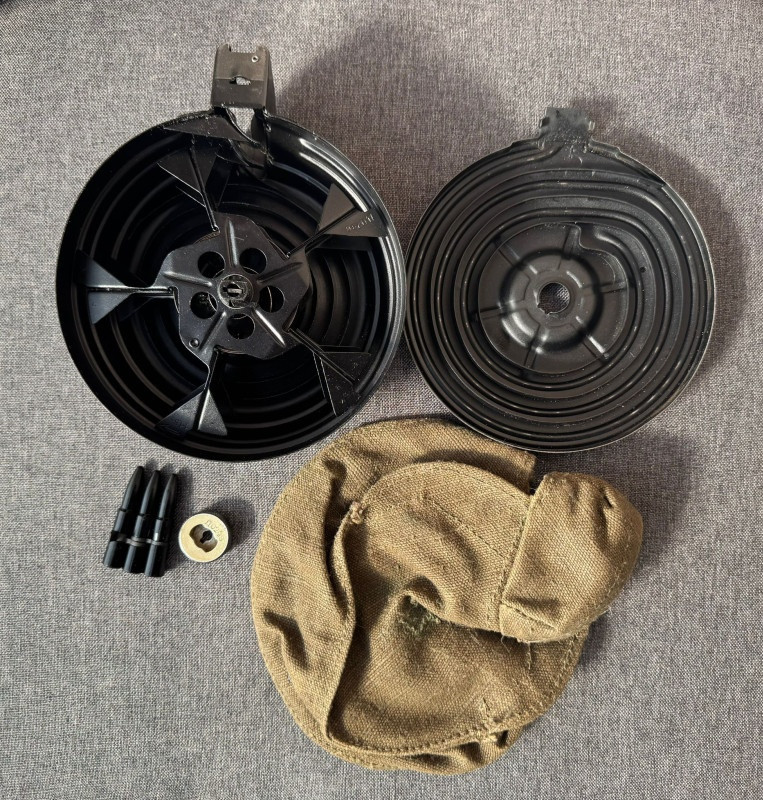 Prodám bubnový zásobník pro RPK v ráži 7,62×39. Pasuje samozřejmě i do ostatních pušek této platformy (AK-47, AKM, Zastava apod.). Jedná se o zahnutou sovětskou verzi, nikoli Norinco. Buben je kompletně sčíslovaný, plně funkční a ve velmi pěkném stavu. Součástí balení je podavač (3 cvičné/falešné patrony), samotný zásobník a původní sovětská sumka. V případě zájmu mě prosím kontaktujte e- mailem. Zaslání přes Zásilkovnu není problém.