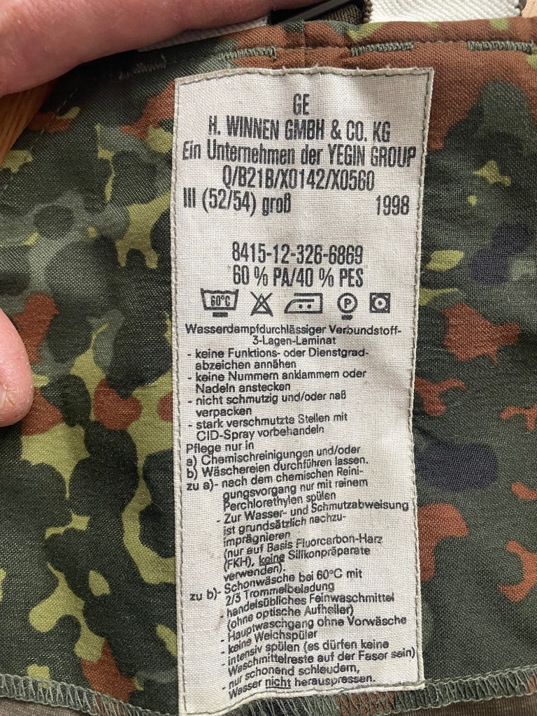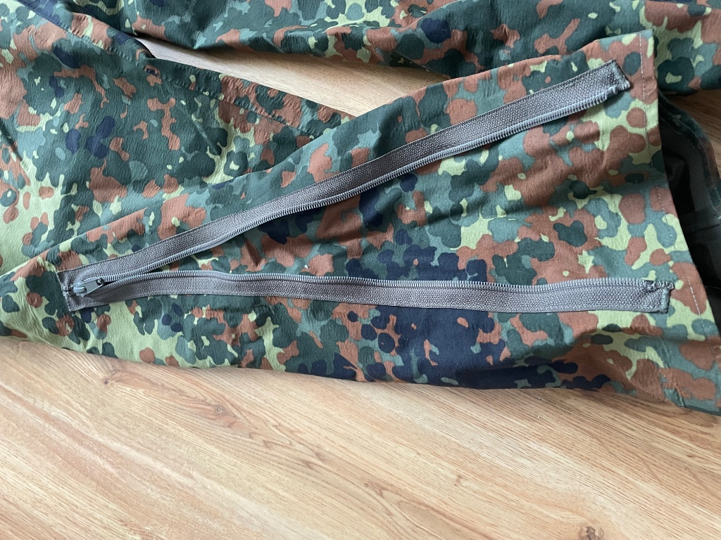 Prodám jako komplet bundu i kalhoty ve vzoru Flecktarn. Bunda i kalhoty nejsou stejné velikosti. Bunda: vel. II (konfekční vel. 48-50), rok výroby 1999, bez německých vlaječek na ramenou, zezadu dole na bundě drobný defekt, zřejmě seškvařeno, již jsem takto koupil. Kalhoty: vel. III (konfekční vel. 52-54), rok výroby 1998, bez defektu, zřejmě málo používané již před zakoupením, koncipované jako převlečník (nemají kapsy, pouze zip, přes který se dostanete do kapes kalhot), suchý zip na bocích, u nohavic dole zip až ke kolenům pro jednodušší oblékání/svlékání. Komplet jsem měl na sobě jen párkrát. Dlouhou dobu nepoužívaný. Prodávám jak je. Zájemcům mohu zaslat dodatečné foto. K vyzvednutí: Chrastava, Liberec, možné za poplatek zaslat zásilkovnou nebo jinou službou za cenu dopravce