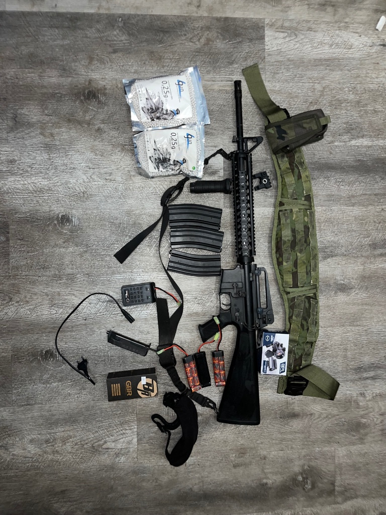 Zdravím prodalm můj airsoft gear bohužel už na airsoft nemám čas a tak se mi na něj v pokoji jen práší. Je tam zbraň M16A4 od výrobce cyma v základu stála 6k. Ochranné brýle. 3 zásobníky 1 tocný 2 tlačný. 3 akumulátory. Nabíječka. 2 pytlíky kuliček. Kolimátor. Opasek moll se sumkou na 2 zásobníky. Granát ten je trochu polámaný. Grip. Plnička. Je vhodné na začátek klidně i pro puberťáka.