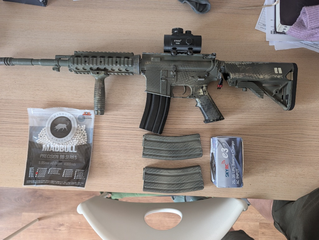 Prodám použitou útočnou airsoft pušku v celokov provedení (vše kromě pažbičky a přídavnémo držátka na RIS liště je z kovu) s příslušenstvím. Zbraň má 16" hlavneň a je v zeleném custom maskovacím nástřiku. Vizuelně je stav zachycený na fotkách. Prodávám z důvodu stěhování a redukce sbírky. Zbraň jsem zakoupil před několika lety už jako použitou od kamaráda co končil s airsoftem. V reálné akci se mnou nakonec nikdy nebyla, pouze rekreační střílení do terče. Včera opět po delší odmlce odzkoušena a střílí bezproblémově jak semi, tak auto. Na zbrani není vidět značení výrobce, z fotek je pouze přímo patrné že obsahuje upgrade AirsoftPro kovovou hopUp komoru a lepší HopUp gumu. Dle vyjádření kamaráda, od kterého jsem zbraň kupoval, by prý tělo mělo být asi od CA, a samotná zbraň byla na míru složená Milošem iNox Mlejnkem. Natahovací páka je napevno přišroubovaná přídavným šroubkem. Pružina by měla být M120 s plně kovovým lepším mechaboxem a přesnější hlavní. Ohledně střev mechaboxu to ale bohužel nedokážu na 100% ověřit, pouze předávám info bez záruky. Mechabox samotný jsem nikdy nerozebíral. Jednak mi chybí doma správný dlouhý inbus a také vše fungovalo, jak má. Jediné drobné negativum vidím v předpažbí s přední ručkou, které má drobnou vůli do stran vůdči hlavni a zbytku zbraně. DeanT konektor pro připojení LiPol baterií (pozor, baterka na obrázku není součástí nabídky). Vzhledem k neznámé kompletní historii nabízím tak levně a bez záruky, zbrani určitě po té době prospěje servis. Celkově je součástí: - zbraň M4 s přídavnou rukojetí - kovový kolimátor Strike 1x40 s redukcí intenzity - 1x kovový tlačný fukční zásobník, přesnou kapacitu neznám, cca 60bbs Jako bonus přidám zdarma ještě navíc: - zbytek pytle kuliček MadBull 0.25g - 2x zelený kovový zásobník k opravě - chybí v obou pružinky s podavačem kuliček - 1x nabíječka LiPol - tu jsem také reálně skoro nepoužíval - plastové krytky prostoru v pažbě, kam lze dát baterku Prosím o prvotní kontakt přes email, tel. číslo je smyšlené. Vzhledem k rozměrům preferuji osobní předání v Praze, jsem ale ochotný solidnímu zájemci poslat přes Zásilkovnu po ČR při rychlém jednání.