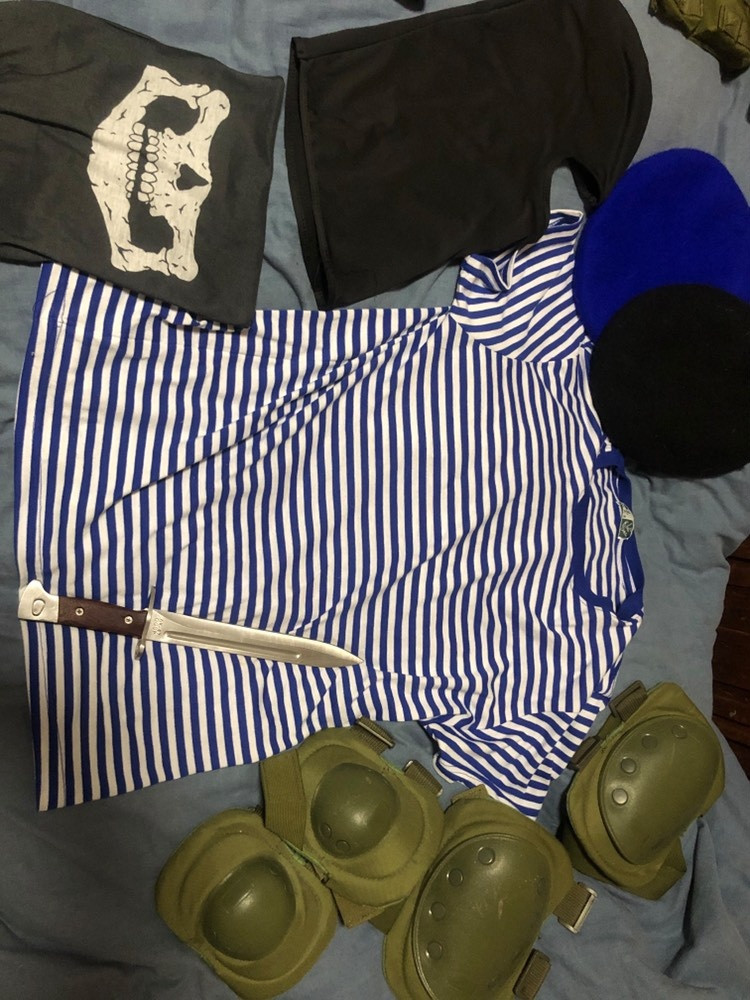Prodám vše co je na obrázku a to je: Telnyashka s krátkým rukávem 300,- Chrániče na lokty a kolena 400,- Barety 200,- za kus Bajonet AK47 700,- Kukla černá + šátek s lebkou 200,- Nejlépe Osobní předání nebo zasílám na zásilkovnu.