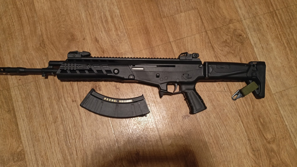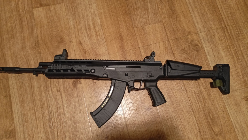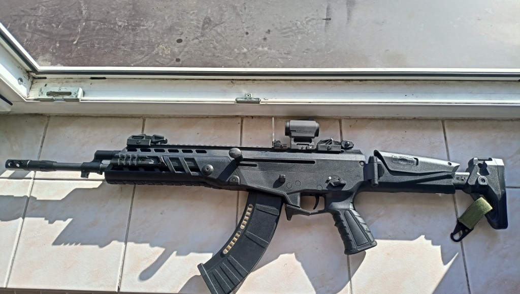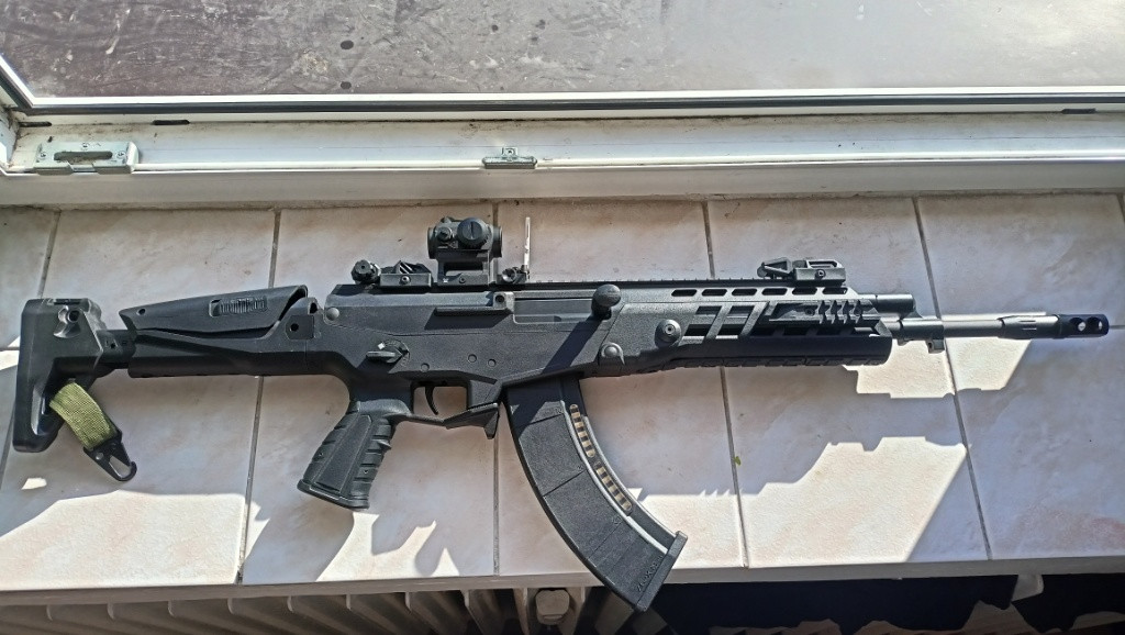 Prodám tuhle pušku v podobě AR-AK dle izraelsko-americké kopie. Málo používaná, má za sebou pár akcí, je ve velmi dobrém stavu. Bez závad, plně funkční. Model: Cyma AK103a BLUE EDITION, kovová hop-up komora, přesná hlaveň 6,03mm, pružina m110,úsťovka 120-130m/s s 0,25bb, dává kolem 1,2-1,5J Sklopná pažba, nastavitelná lícnice a botka. Konektor je malá tamya Délka 900-970mm --- puška nemá žádné závady! K pušce přidám 3 tlačné zásobníky, každý má kapacitu 200bb. Pušku prodám bez kolimu a flashlightu. Osobní odběr. K pušce přidám akumulátor 7.4 Lipol --- Původní cena - 5420,-