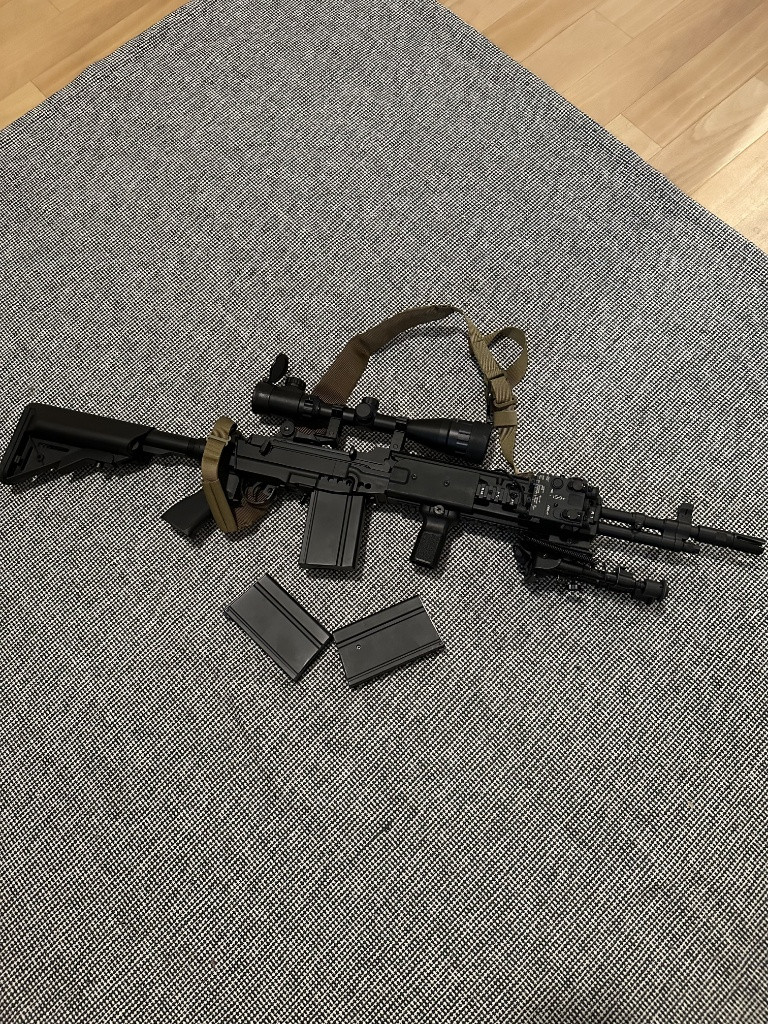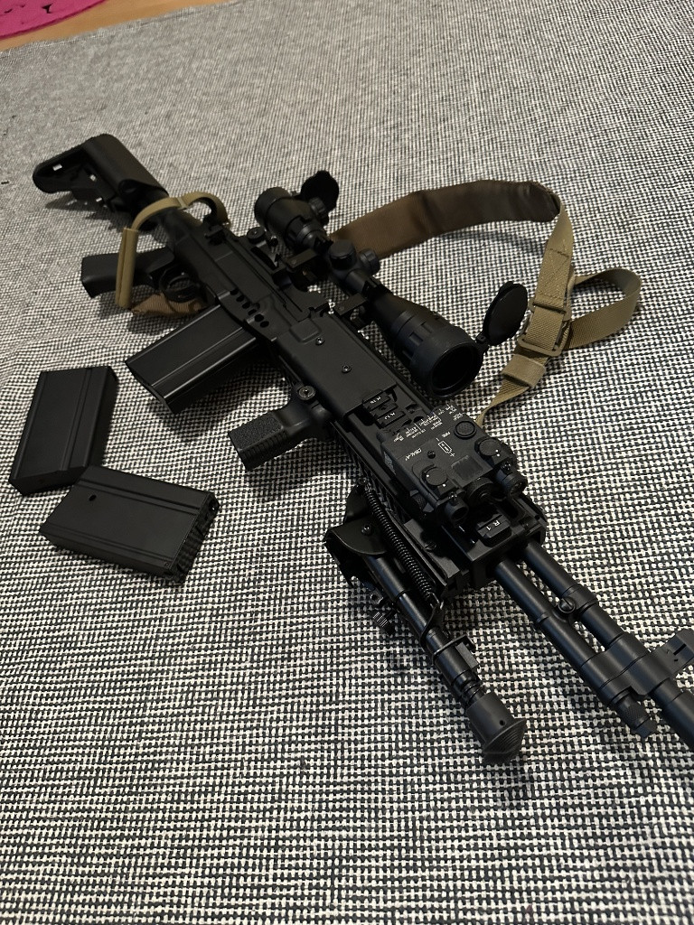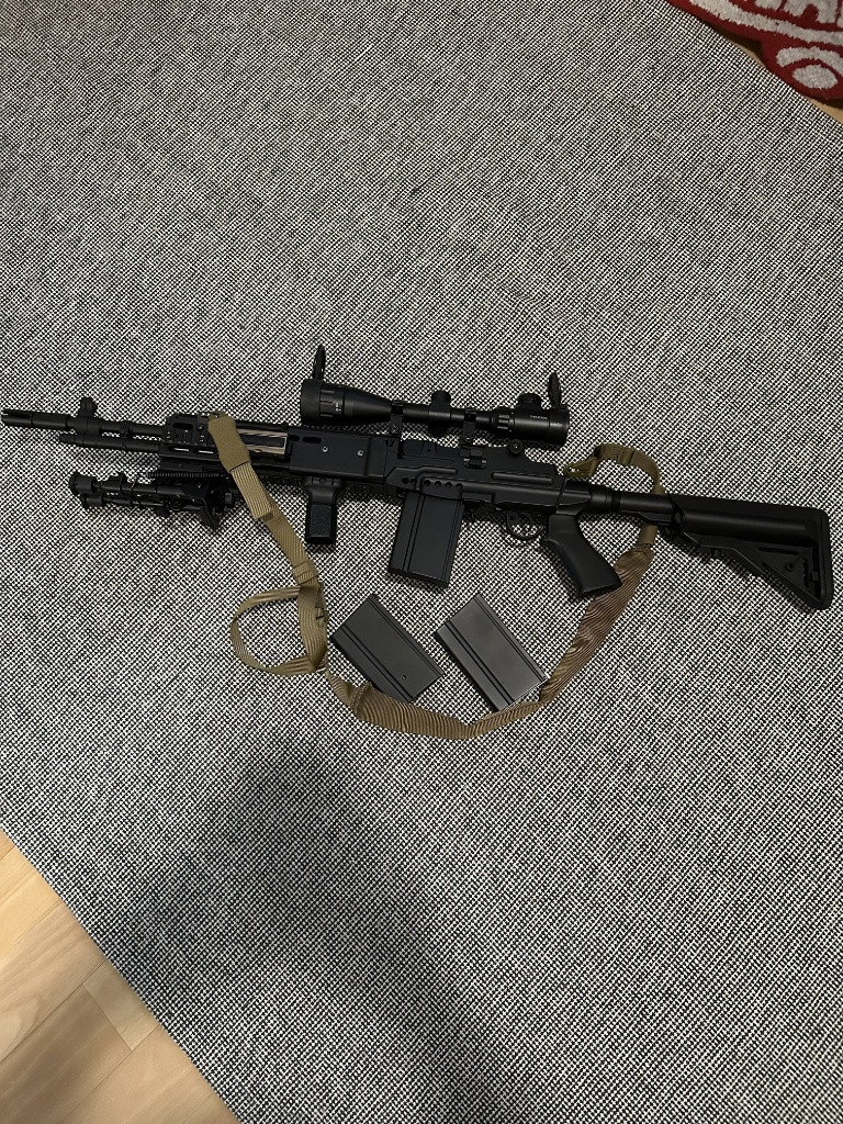 Prodám airsoft zbraň M14 EBR od CYMA se vším příslušenstvím co je na fotce. Příslušenství: Optika 3-9x40AOE s regulací paralaxy regulovatelný BIPOD ručka součástí 1x točný zásobník a 2x tlačný plastový DBAL-A2 tlakový spínač popruh Zbraň je v základu. Stav úplně nový, ani jednou nehrána. Cena za komplet: 8000 Kč Ideální osobní předání v Brně, ale po domluvě můžu zaslat na dobírku