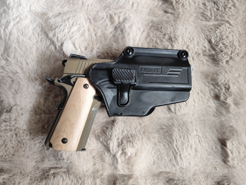 prodám airsoftovou repliku zbraně colt 1911 plně funkční má jeden zásobník, celokov, green gas, blowback pouzdro k tomu, ručně delané bukové střenky