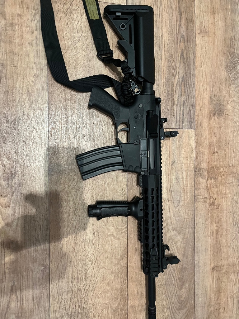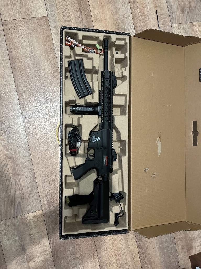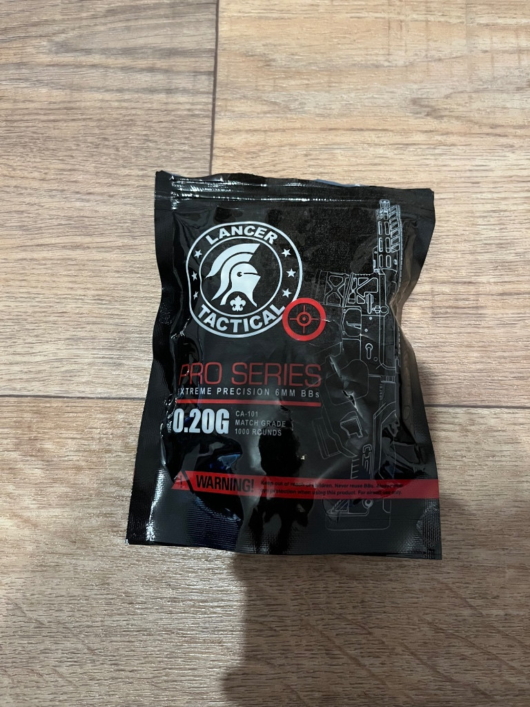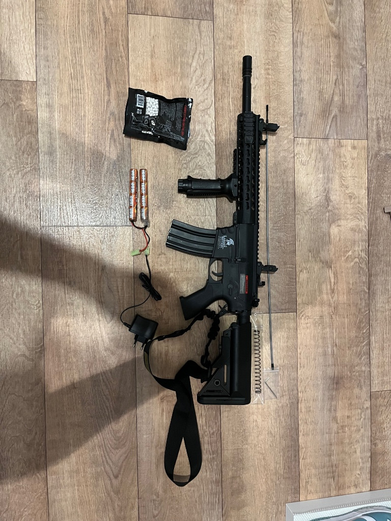 Zbraň je málo používaná a je na ní navíc přidaný grip. Balení obsahuje 1x kovový zásobník na 300 kuliček, nabíječku, baterku, 1000 kuliček 0,20g, tyč na čištění hlavně a náhradní pružinu.