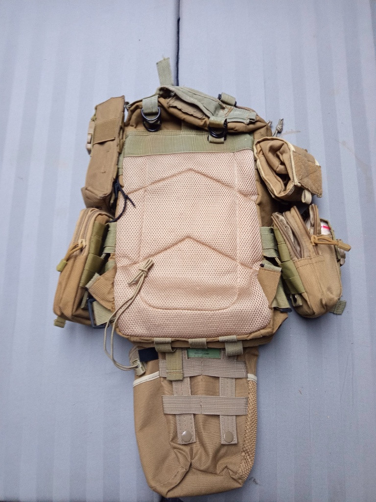 Menší bágl v Coyote barvě, s různýma sumkama, bez popruhů.