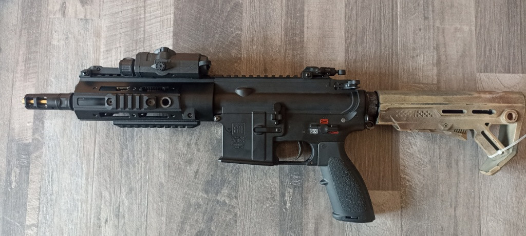 Prodám CQB kvér. Jedná se o specna sa-h07 v blbuvzdorném upgradu ( zasuneš baterku a jedeš ) :D. Mechabox základní s kabely 2.5mm a mosfetem ( nebyl potřeba cnc na 120ky pružiny ). Zánovní kola SHS 18:1 s vačkou vypodloženo a promazáno. Vzduch - ( gate hlava válce, teflonovy válec AA(3/4), EPES tryska 21.4, píst specna s celokovovými zuby + hlava specna). Motor Asg 30K. Hlaveň cca. 300mm a hopka základní. Guma SHS 70. Kabely i mosfet zvládají bez problémů baterky 14.8V, kadence jen pak kolem 28rps. Korekce aoe provedena podložkou pod hlavu pístu. Naměřený výkon 1.8J s 32 na výše zmíněné 120ce. Ke zbrani 3 zásobníky točné ( specna a we) + imitace peq.