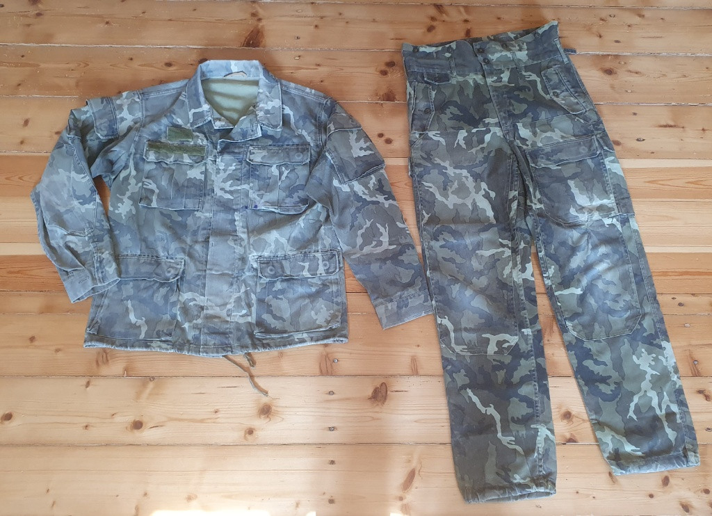 Na prodej dosti mazácká/onošená uniforma vzor 85V s potiskem. Z razítek jsou již zbytky ale lze domýšlet rok výroby 1992. Kalhoty velikost 3 47 (180 94) blůza 2 50 (176 100). Stav viz foto. Na blůze flek od inkoustu a nějaké zašívání. Na kalhotách ne koc šikovně zašité koleno. Viz foto. Cenu nabídněte.