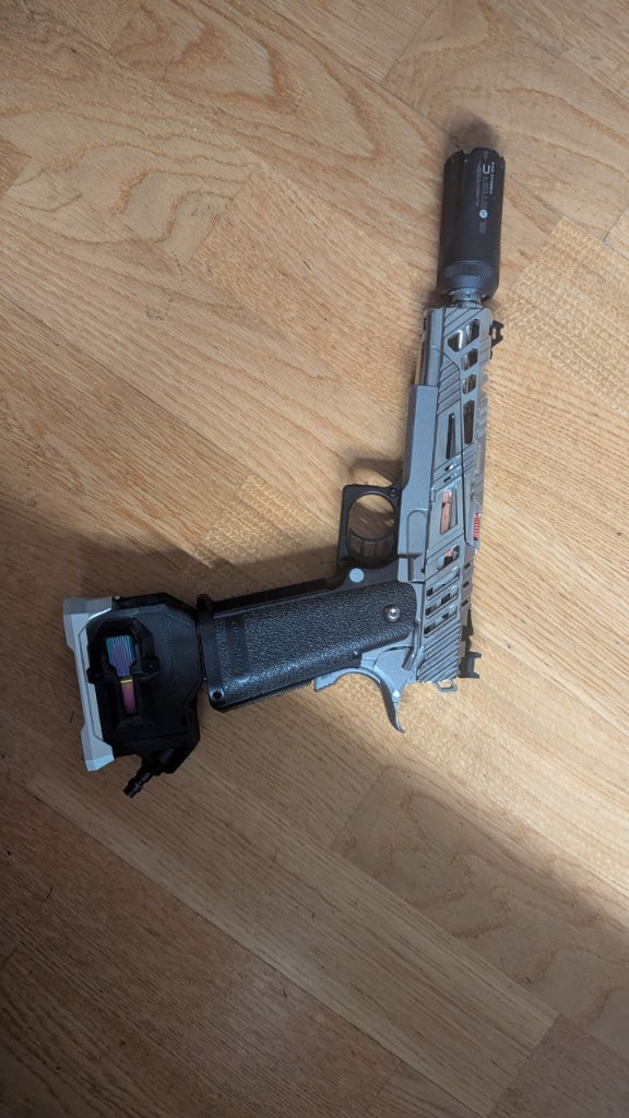 Prodám pistoli Hi-Capa 5.1 v tuningu od CTM TAC. hlaveň Maple Leaf 117 mm zelená gumička Autobot (pravděpodobně Maple Leaf) CNC hop-up od Maple Leaf vodítko pružiny Cow Cow zesílená vratná pružina Guarder vzduchová komora Marui zesílená vratná pružina pístu zesílená pružina spouště blokátor zadržení závěru vnější díly (slide) od CTM TAC tracerová nástavba s imitací výstřelu panely pro zkrácený chod závěru od CTM adaptér na HPA od CTM TAC (bere M-series zásobníky) V balení dám: tři zásobníky M-series green-gas zásobník od Marui veškeré náhradní drobnosti (gumičky, pružinky apod.) Cena: 14 000