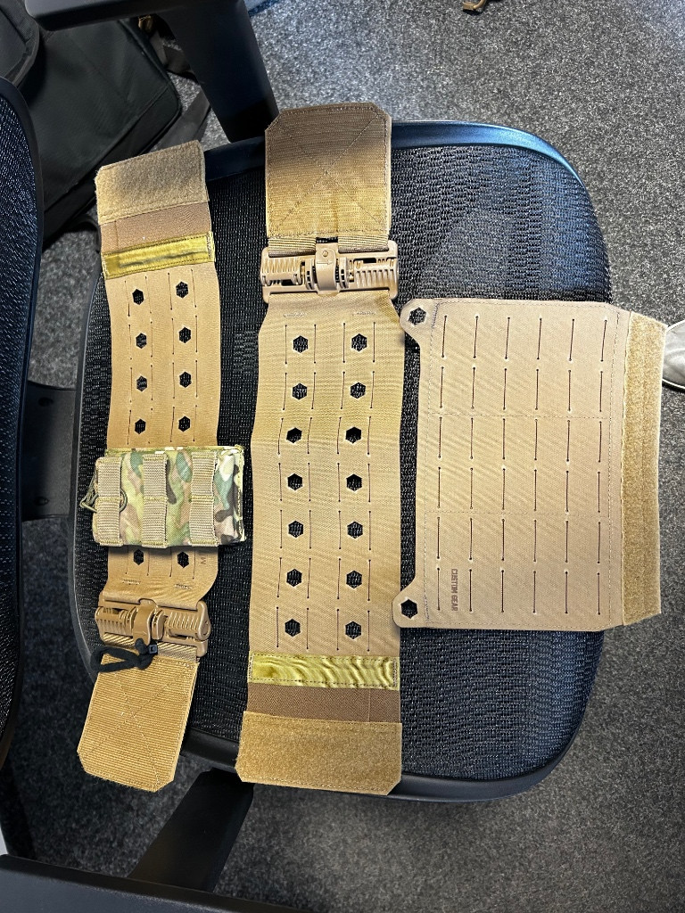 Prodám nosič plátů CGPC3 vč. 2x plátu Hardox. Velikost M. Přední panel na 3 AR zásobníky, přední panel na 4 smg zásobníky. Elastický side pocket na AR zásobníky (pár), zádový panel (neoriginální). Sumka na AR zásobník. CGPC3 side panel. Podvěsná kapsa.