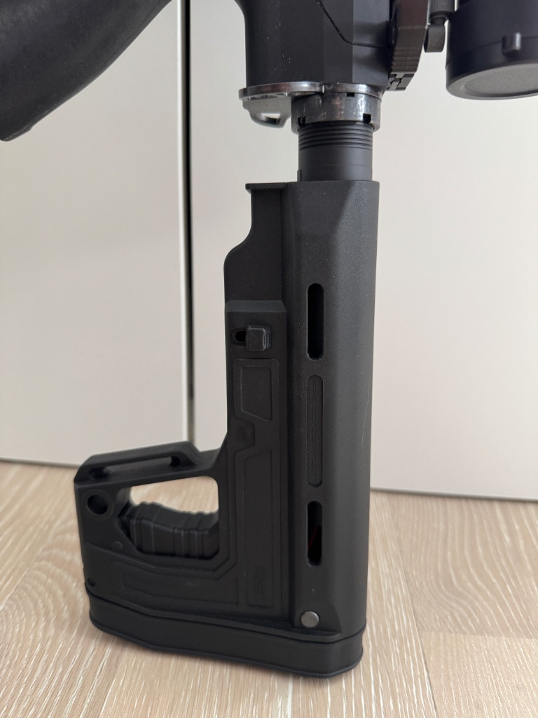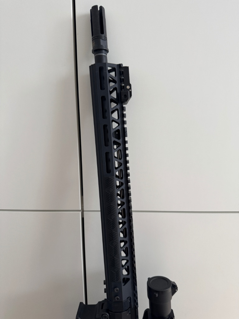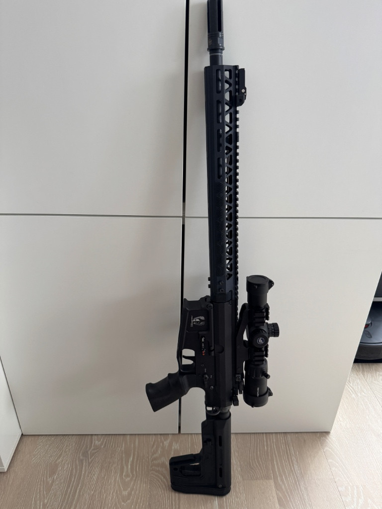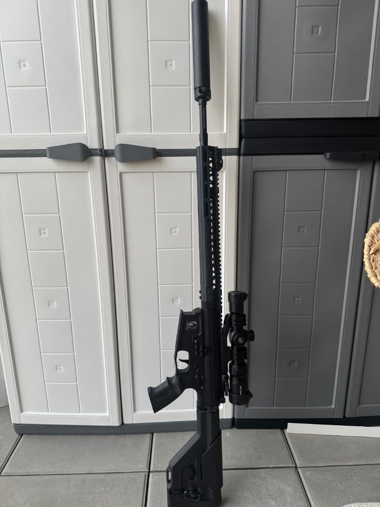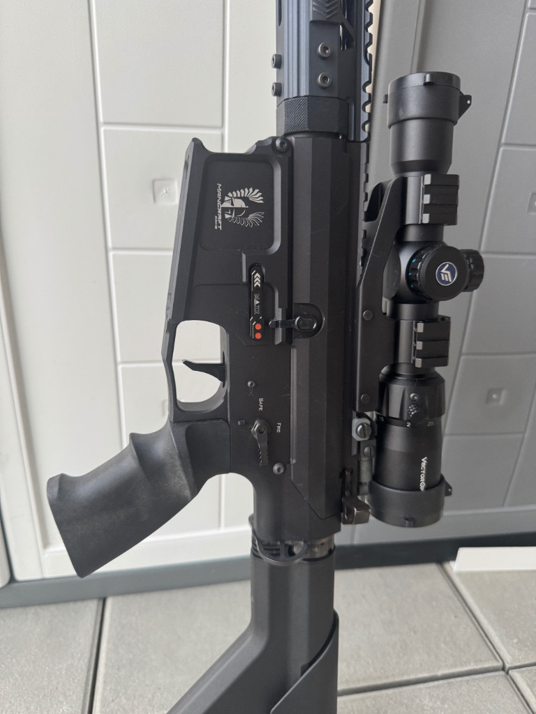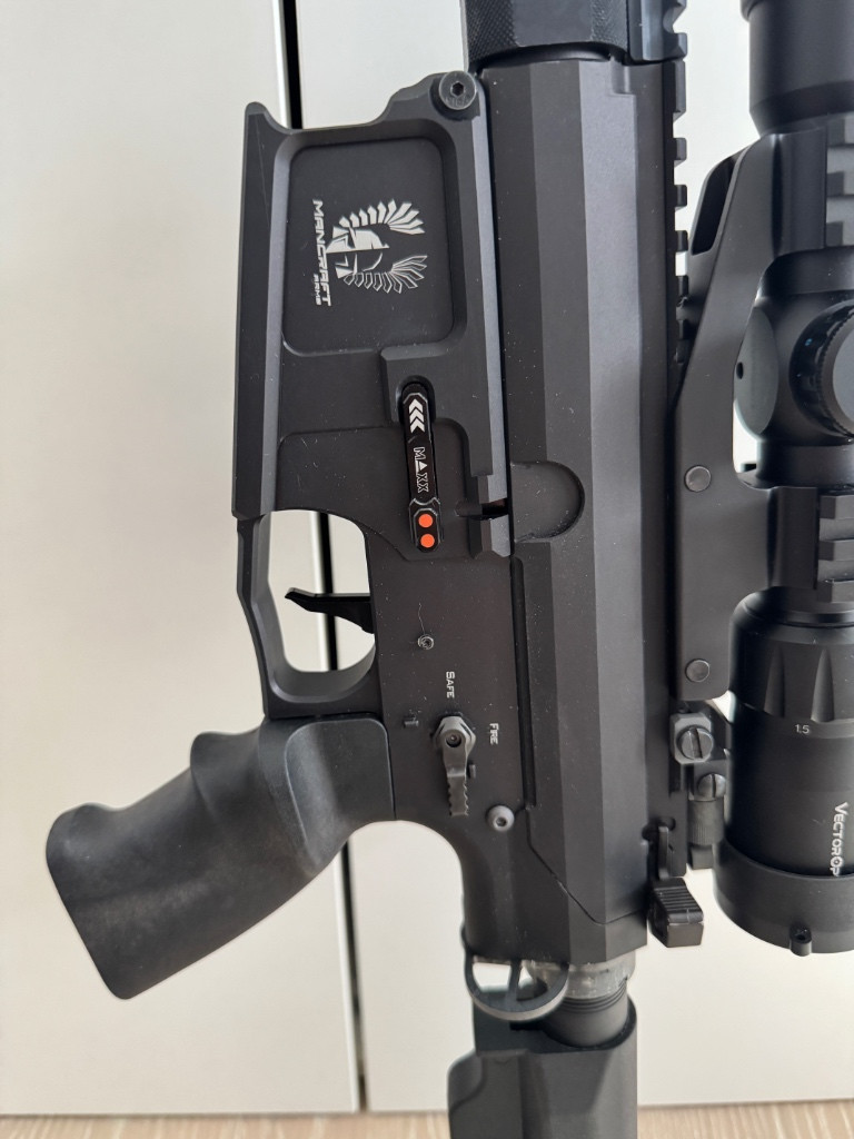 Od základu stavěné SR25 (Ar10). Tělo CNC Mancraft, tubus pažby pro ostré Ar od UTG, předpažbí CNC 13" RetroArms, Pažba RS1, ovládací prvky od Maxx. Uvnitř CNC Mancraft mech, CNC RetroArms komora, Epes tryska, SHS hlava válce i pístu, RetroArma píst pro SR, CNC SHS kola pro SR, Retro ložiska, procesorová jednotka, hlaveň Lambda 6,05, guma ML Macaron 60. Kvér kupovaný z druhé ruky, přidám pažbu ICS, předpažbí z Mk12 mod 0 a Vector Mustang.