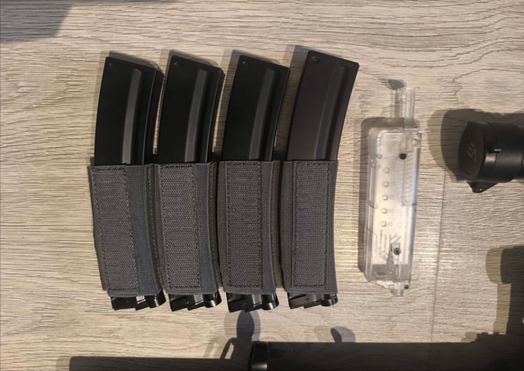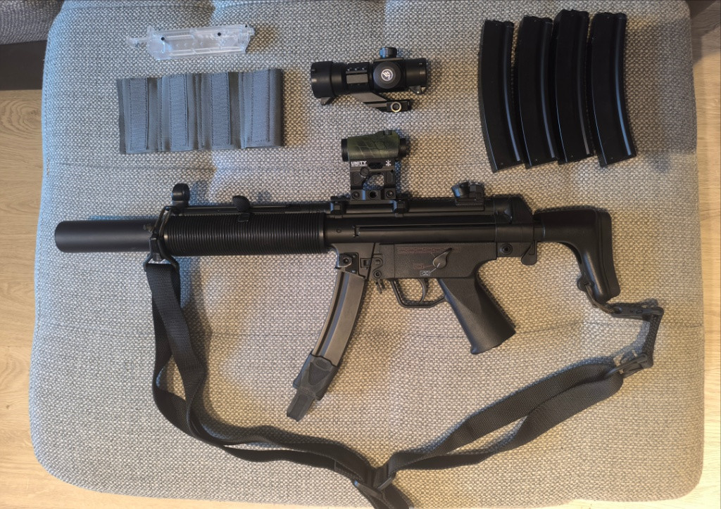 Prodám zánovní kousek Cyma MP5SD6 verze Blue Edition AEG. Odehrála 3 akce, vystříleno max 3000 kulý. Uvnitř je upgrade na 2,1J s 0,32g viz foto. Seznam použitých dílů: Vnitřní hlaveň: KM Head 6,04 - 300m. Hop up gumička: 4Uantum Friction Pro oranžová. Motor: Specna Arms Dark Matter 31k. Procesorová jednotka: Perun hybrid V2. Kola: SHS CNC 18:1. Pružina Poseidon ekvivalent M125. Vzduchotechnika: RA píst, AS Parts POM hlava pístu, AS Parts tichá hlava válce, AS Parts válec s dírou, AS Parts tryska. Replika má slušný soustřel i dostřel. V ceně jsou 4 tlačné a jeden točný zásobník. Na výběr je kolimátor T1 s Unity montáží nebo replika Aimpoint Comp od Vector Optics. Zdarma přidám sumku pro 4 zásobníky, popruh MS3 od FMA a rychloplničku. Pořizovací cena byla cca 14500kč. Pro více info volejte/pište.