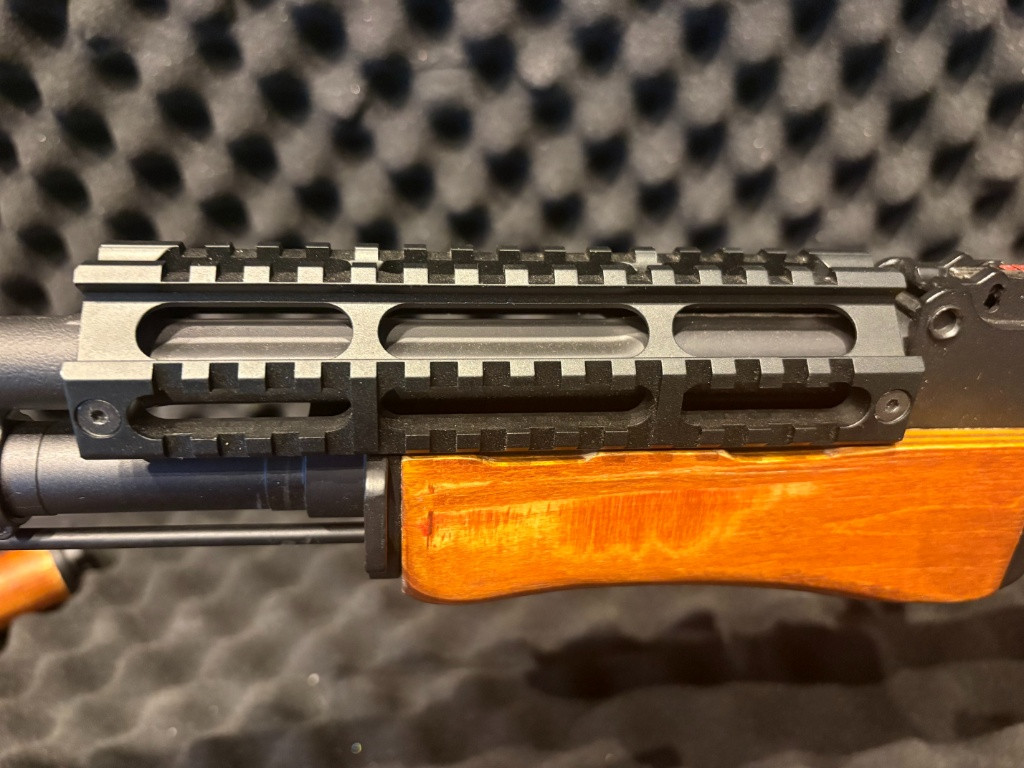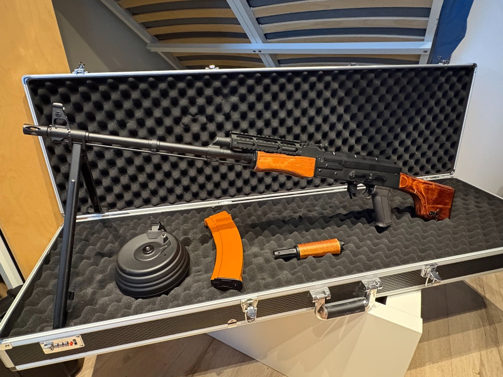 Prodám zánovní nehraný kulomet RPK, byl použit jako rekvizita na výstavě. Zbraň je v základu, podle v výrobce úsťová rychlost cca 125m/s. Na zbrani je RIS vrchník část předpažbí. Ke zbrani je původní vrchní dřevěné předpažbí, točný zásobník na 800 ran a buben na 2500 ovládaný tlačítkem nebo zvukem. PRODEJNÉ POUZE JAKO KOMPLET! Více info mail.