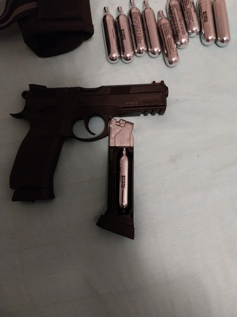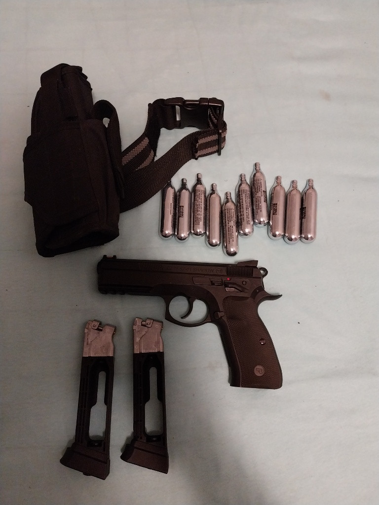 Prodám cz 75 schadow bez blowbeku jsou k tomu 2 zasobniky 10 bombicek a pouzdro.vse co je na fotkách.zbran má svetlovodnou mušku.