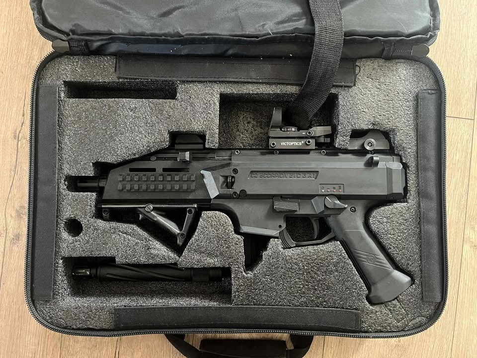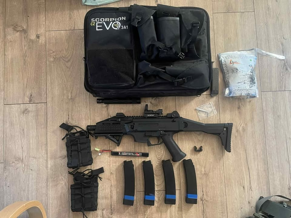 Prodávám Airsoftovou zbraň CZ Scorpion EVO 3 A1 od značky ASG ve stejnoznačkové cestovní brašně, která je pro tuto zbraň vytvořena. Společně k tomu prodávám 4x zásobníky, spodní grip, popruh, kolimátor, tlumič s nástavcem na hlaveň a dodatečné sumky pro všechny 4 zásobníky se systémem molle a kuličky. Celkově byla tato asirsoftka použitá asi 4x s tím, že nebyla vystavena žádnému extrémnímu vlivu. Baterka byla nabíjená pouze jednou a to ihned po koupi. Zde přikládám stránky, kde byli věci koupeny: https://airsoftpro.cz/cz/airsoftove-zbrane/elektricke-dlouhe- aeg/cz-805-bren/airsoftova-zbran-cz-scorpion-evo-3-a1- detail https://airsoftpro.cz/cz/zasobniky-plnicky/pro-elektricke- zbrane-aeg/zasobniky-ostatni/baleni-3-kusu-zasobniku-na- 75-ran-pro-asg-scorpion-evo-3-detail https://www.airsoft-online.cz/prepravni-pouzdra/transportni- brasna-pro-scorpion-evo-3-a1/? srsltid=AfmBOop_nbJ1BXdu1CsObAM-PqAoGF3-- Gz5tQ6gFeK4HKQCU4S-KxSx Zbytek je k tomuto kompletu spíše asi jako dárek za rychlou a bezproblémovou koupi. Tuto zbraň jsem měl spíše jako příležitostnou a proto nebyla nijak využita než jako mířená střelba. Čas jsem si na ni nenašel a tak ji hodím do oběhu pro někoho, komu se bude více hodit do výbavy.