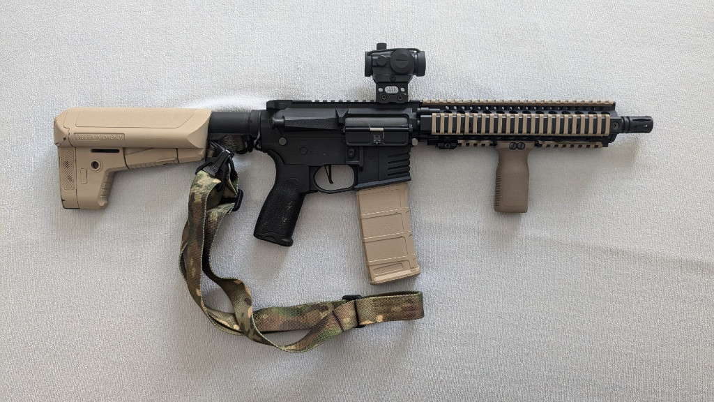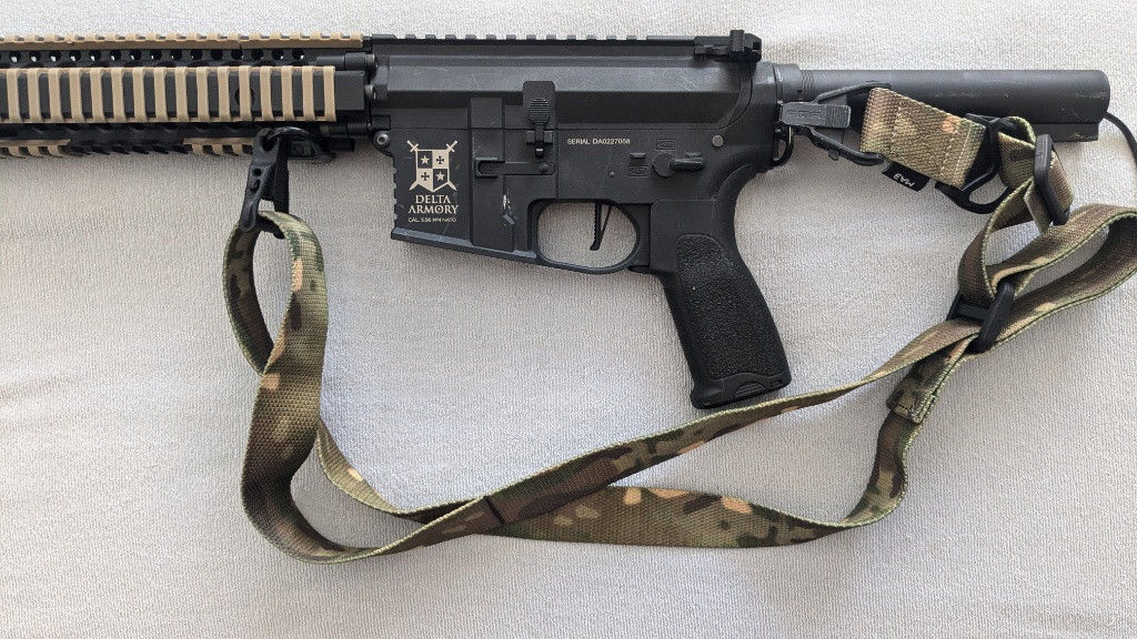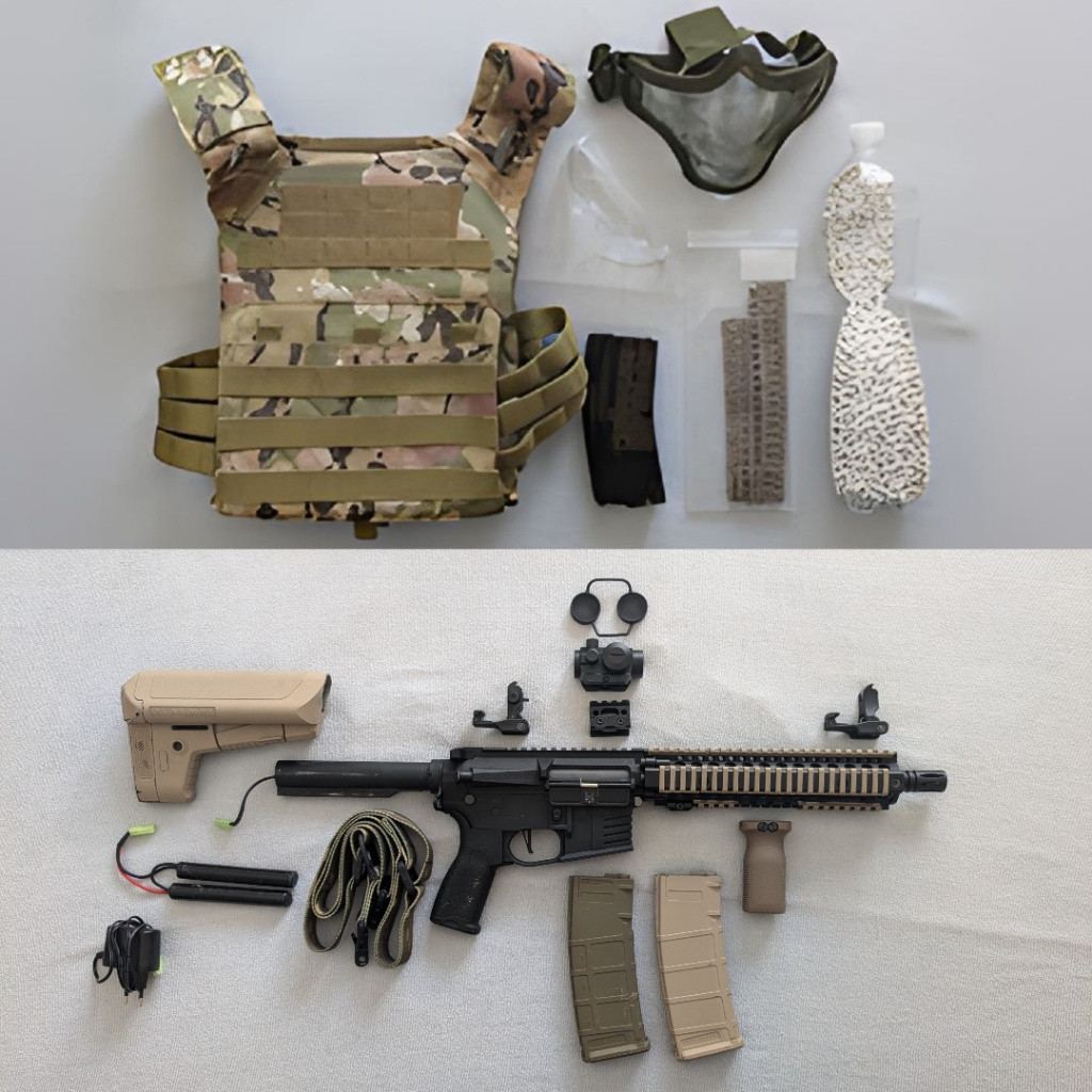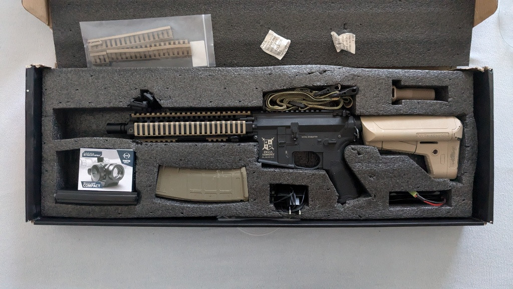 Prodám rok starou MK18 od výrobce Delta Armory s kolimátorem, gripem, gumovýmy rail covery, slingem, 2x zásobník a zbylou potřebnou výbavou jako je baterka, nabíječka, atd., která byla v balení. Dále také nabízím vestu, masku, brýle, plničku, zbytek kuliček 0,25g a ještě nějaké rail covery navíc. Jsem ochoten prodat zbraň samostatně bez této výbavy. Zbraň byla 4x použitá, 2x na akci a 2x s kamarády, je plně funkční a ve výborném stavu. Prodávám z důvodu nevyužití. Pažba společně se zásobníkem, co přišli se zbraní, byly přestříkané na FDE barvu. Grip, rail covery a druhý zásobník jsou v barvě TAN. Barvy sice nejsou stejné, ale myslím si, že to určitě vypadá lépe než originální černá. Při nejhorším se to vždy dá přestříkat :D. Zásobníky jsou tlačné a mají kapacitu kolem 120 kuliček. Vesta, maska a sling jsou v kamufláži s názvem multicam.