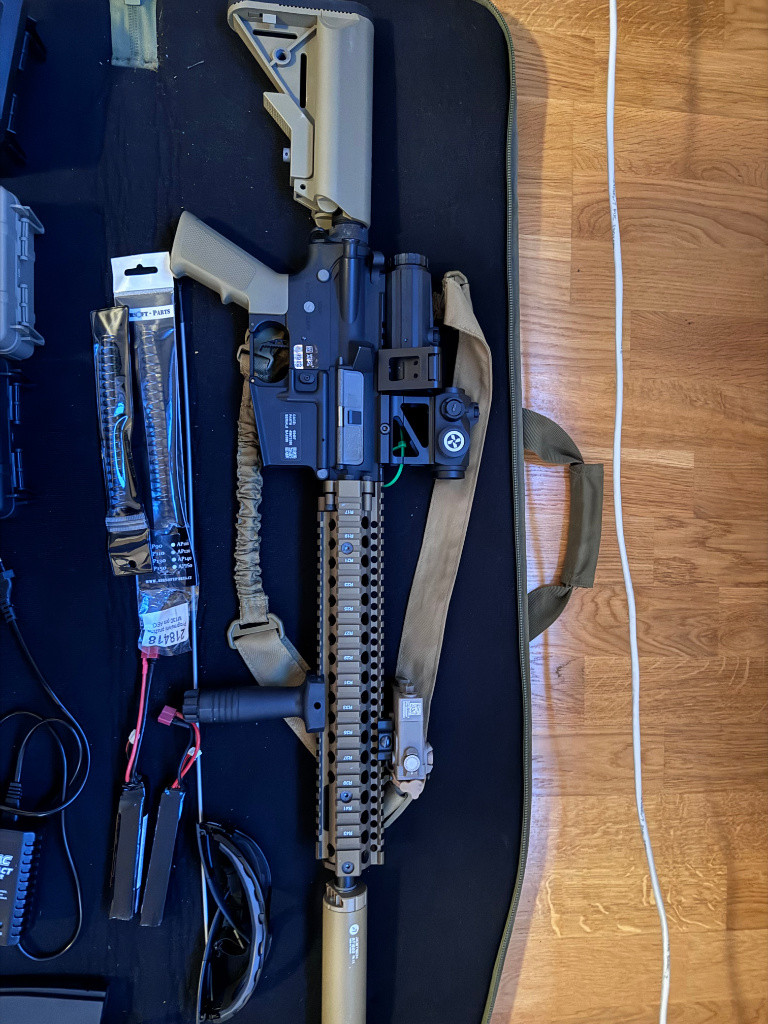 Přenechám komplet výbavu na airsoft. Zbraň kupovaná 26.9.2022, ale byla tak na 12 akcích dohromady. Teď s dětmi již nemám čas vůbec. - Daniel Defense MK18 SA-E26 EDGE 2.0 + původní faktura - Norvitsch optika - Nasvětlovací tlumič - Red dot - Svítilna DBAL A2 - 5 točáků + plnička - Sumky - Rukavice - Pyrex brýle, maska - Vesta - Chrániče na - kolena - Silnější pružina - 2x baterka + nabíječka - Kuličky co mi zbyly