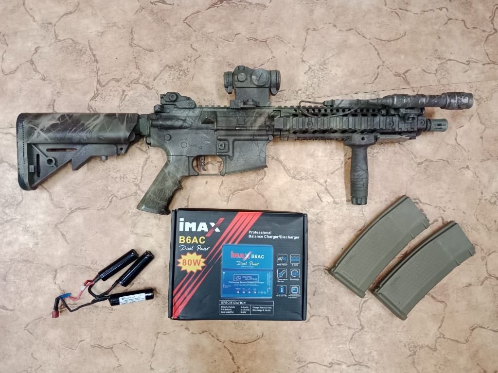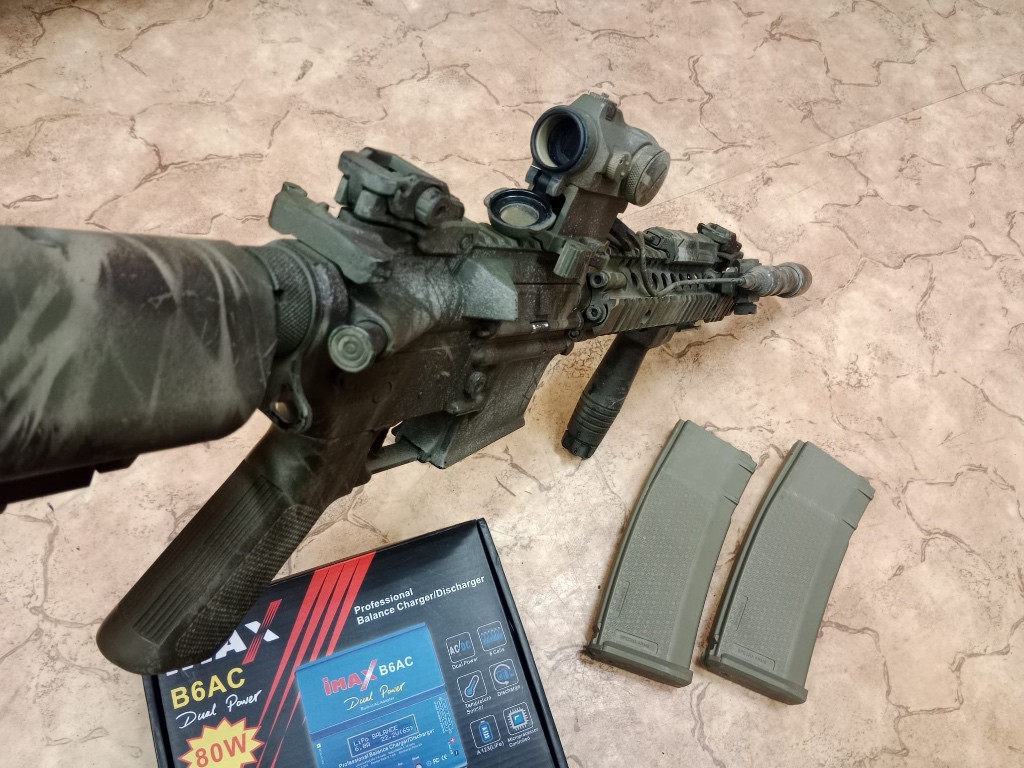Základ,nástřik,svítilna,spínač,kolimátor ,2x zásobník ,baterie,nabíječka . Vystřelen necelý pytel 4000 kulí.
