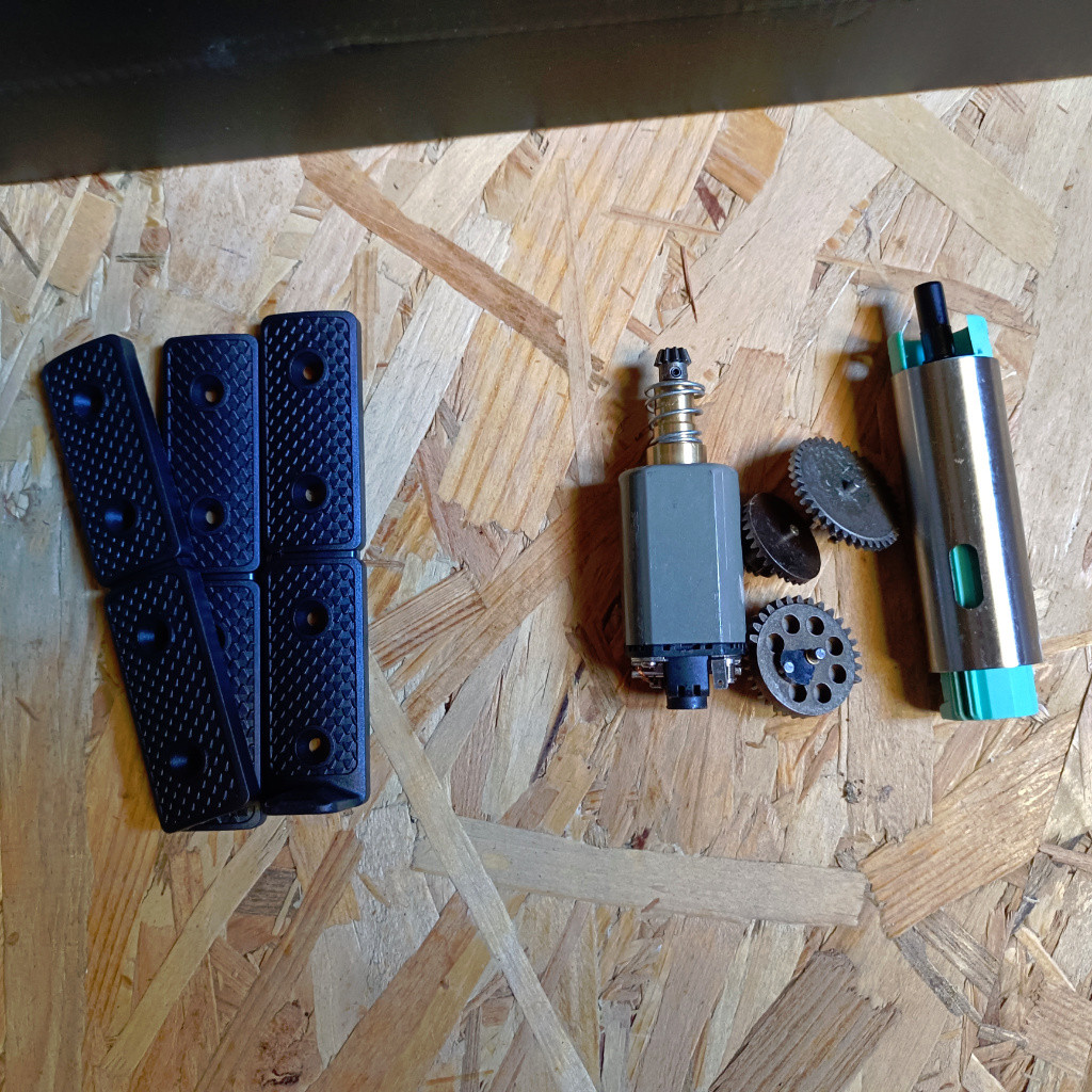 SHs 16:1 CNC kola, válec, hlava válce, tryska, píst, hlava pístu, AOE korekce, přepodložení, doraz komory, nerez hlaveň 6,02 pružina a neodym motor. Vše jede velmi slušně oproti tomu základu, který byl slabší, mimo dobrého těla a mechaboxu. 1,6J výkon. Prakticky stav uloženky. Jsou k tomu dva zásobníky a původní díly.Samotný upgrade za 6k od airsoftservis divokyzapad.cz (je tam i to video)