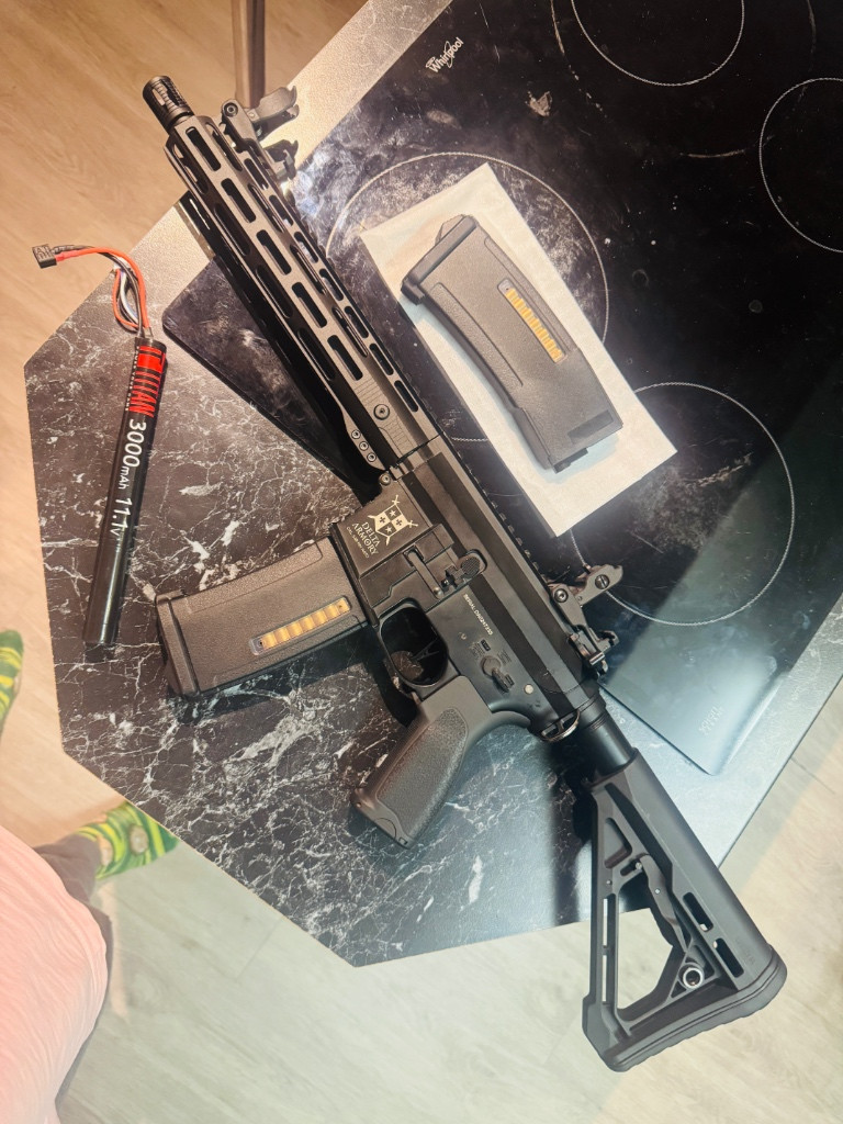 Nabízím k prodeji M4ku nově postavenou. Uvnitř se nachází nerezová hlaveň shs 6,03mm 270mm, 4quad hopguma, CNC Retro komora, střeva jsou použity z DA Freya Gen2 takze komplet CNC usazené v mechaboxu Aether a vše ovládá BT jednotka Scylla, motor vysokozatezovy DA Freya. Tělo nese známky používání mel jsem v tom původně postavené DMR ale vnitřnosti šly ven a složilo se z toho krátké AR. Zbraň dává výkon cca 1,7J na 0,32g kulích viz foto. Ke zbrani mohu nabídnout i baterky, zasobniky kolimatory nebo svítilny vše je o domluvě.