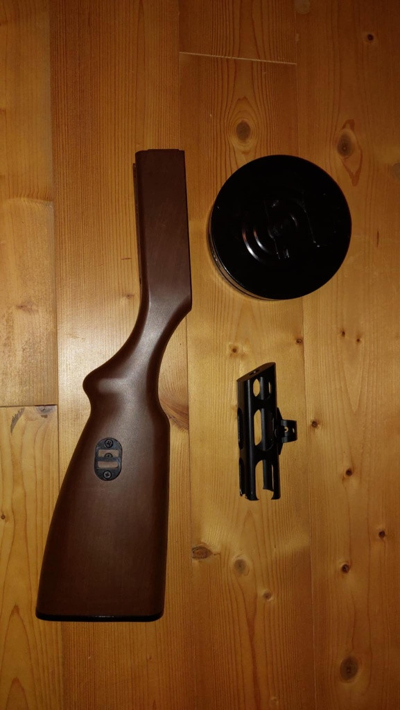 Nabízím nepoužitý bubnový zásobník, ABS pažbu a mušku ke Špaginu (PPSH-41) od firmy S&T. V případě zájmu mohu přidat i segmentový točný zásobník. Nejlépe bych chtěl celek vyměnit za čtyři tlačné segmentové zásobníky k této zbrani. Případně se můžeme dohodnout na ceně.