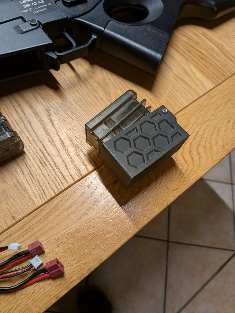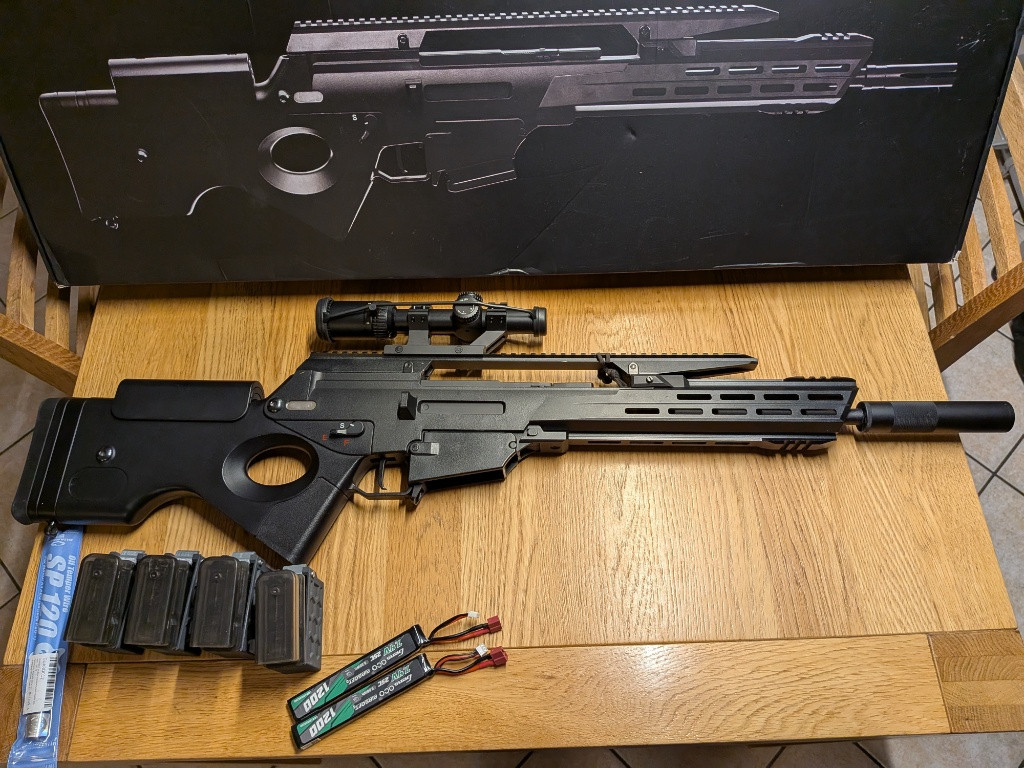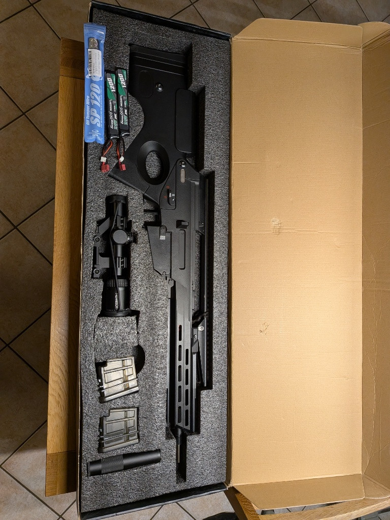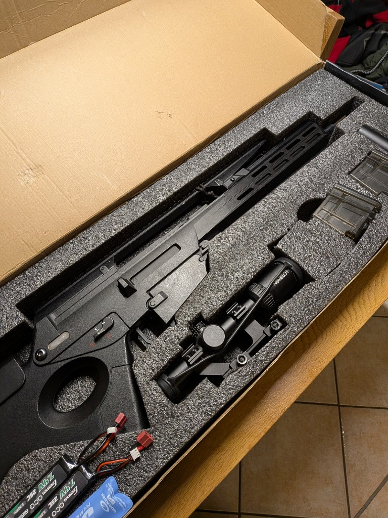 Prodám SSR63 A3 od Novritsch jedná se o DMR má přesnou vnitřní hlaveň prodlouženou do tlumiče. Střílel jsem kuličky 0.36g a snimy jsem měl 2.3J dám k tomu i slabší pružina kdyba byla potřeba ale jako DMR byl výkon tak akorát. Optika je 1-4x Variable Scope “LPVO” (BB Proof) od Novritsch. Ke zbrani přidán 2 baterie a 4 zásobníky SSR63 A3 Magazine Gen2 (65 BBs) a 4 sunky na zásobníky. Zbraň byla na 3 akcích protože jsem si chtěl vyzkoušet tento herní stil, natchl mě takže přecahzim na hapa dmr.