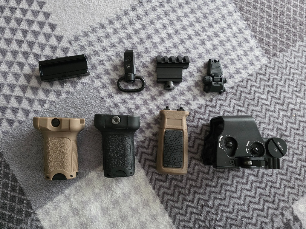 Prodám doplňky na airsoftové zbraně. - Kolimátor PCS Bolo Sight Mod. X - prodáno - vertikální rukojeť BD M-Lok béžová - prodáno - vertikální rukojeť Shooter černá - 100,- - vertikální rukojeť FMA béžová - prodáno - montáž Cloud Defensive na spínač svítilen typu Surefire - 250,- - Offset montáž pro kolimátor/svítilnu A.C.M. - 100,- - M-Lok poutko na popruh - 30,- - zadní sklopné mířidlo Spacna Arms - 100,- Na cenách je možné se domluvit. V případě zájmu mě kontaktuje pomocí SMS nebo emailu. Osobní předání v okolí Plzně, jinak zásilkovna nebo balíkovna.