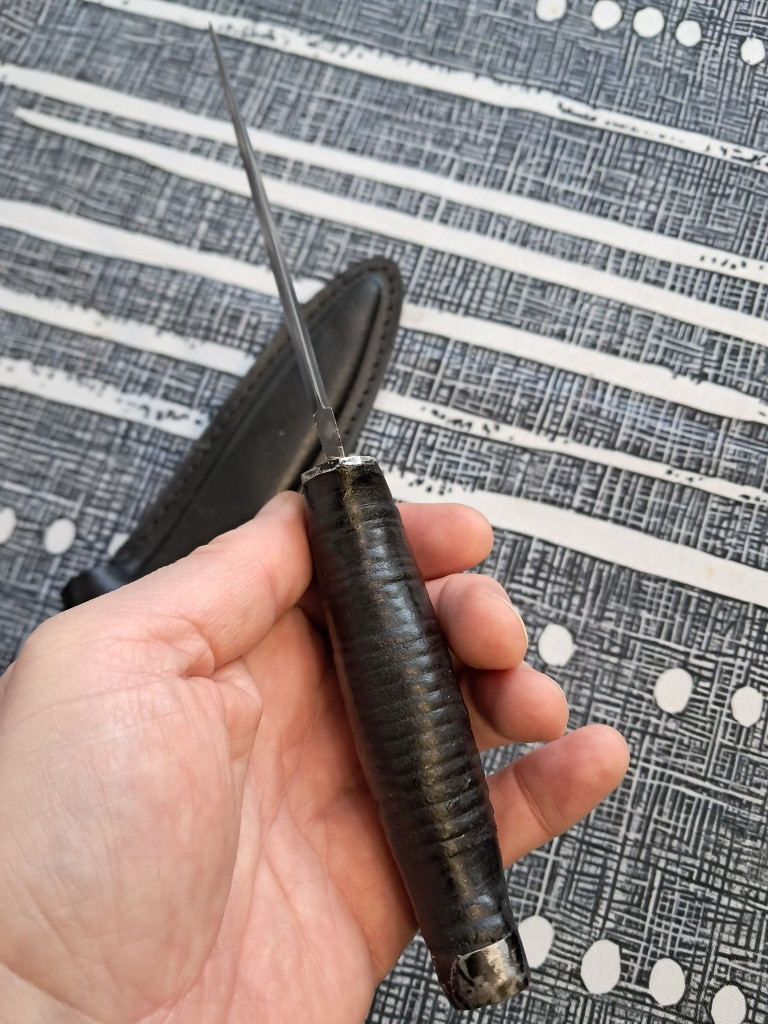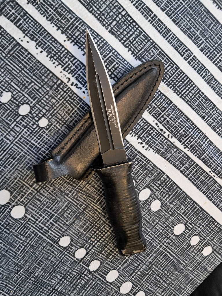 Prodám mnou osazenou dýku SW čepel (nerez 440) cca 11cm, ručka mořená kůže také cca 11cm, kovová koncovka. Nabroušená, ostrá, taková inspirace zákopovým nožem WWI