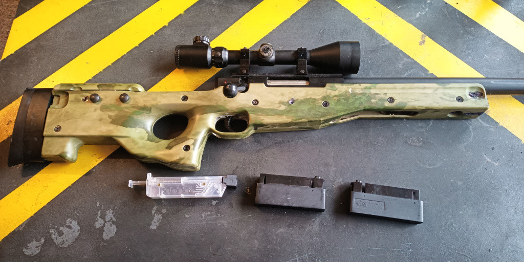 Prodám L96 od E&C v lehkém ugradu. Komora ASpro s gumou od SilverBack, dopadovka EPES. Tělo je vyplněno pěnou a byla odstaněna závaží, aby se snížila váha. Výkon je 2,5J (měřeno na 0,36g). Ke zbrani přidám plničku s nástavcem na plnění L96 zásobníků. Pořizovací cena byla přes 5000. (TFH)