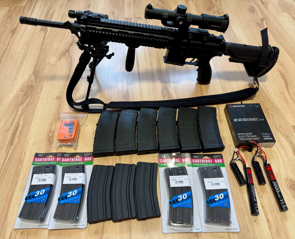 Prodám E&C M27 Advanced series (AirsoftPro). Tělo mechaboxu původní, upgrade vnitřních dílů (zátěžová kola, zátěžový motor, teflonový plný válec, píst, tichá hlava pístu/válce, ramínko...), hop-up komora MAXX Model Pro, hlaveň KM Head, optika Victoptics 1-6x24, FMA AN/PEQ 15 LAC-5, bipod, rukojeť, zásobníky, 2x baterie Titan. K tomu přidám procesorovku Kestrel V2 se snímačem zásobníku. Zbraň odladěna kvůli omezením na akcích na 1,6-1,7J s kuličkama 0,30g. Prodám jako komplet.
