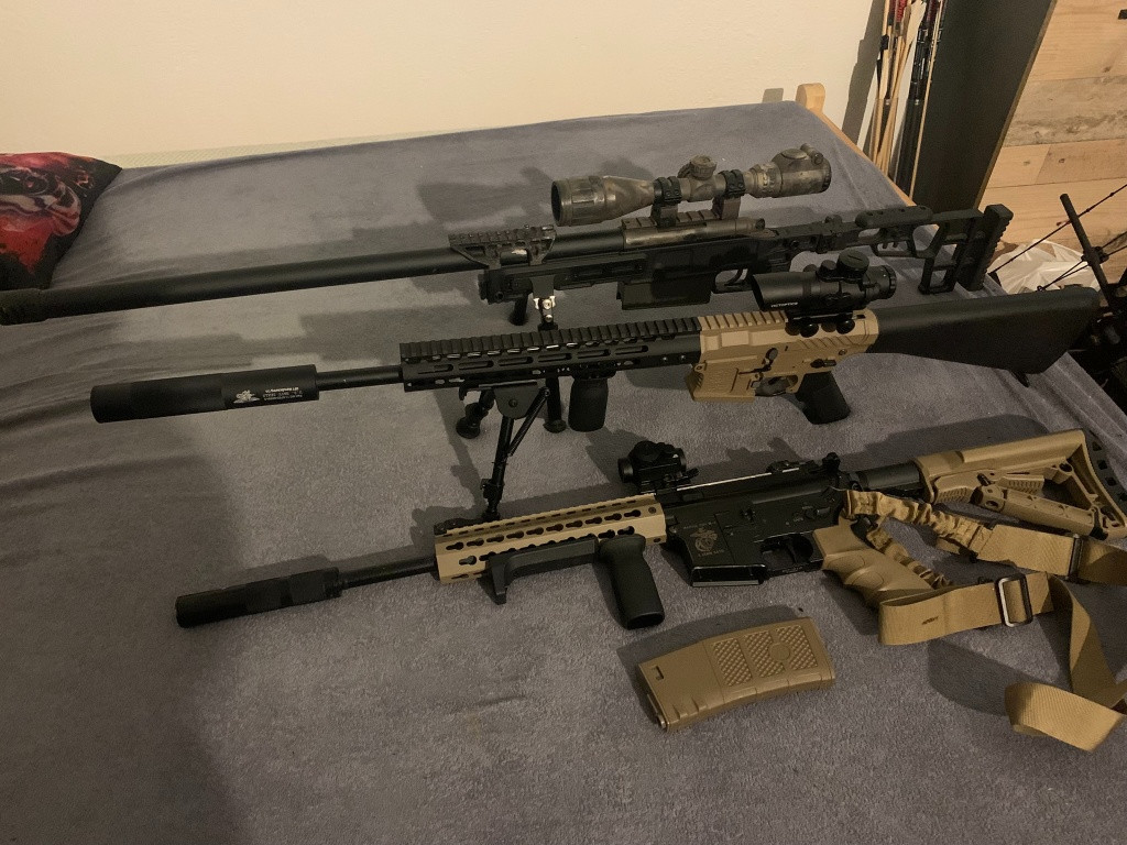 Nabízím k prodeji tuto AR - původně E&C MK110. Základní mechabox je uložený v polymerovém těle G&G kvůli snížení hmotnosti. Hopup ProWin, gumička SHS modrá, hlaveň Poseidon 6,05mm. Mosfet, konektory T-Dean vyvedené do pažby. Baterie LiPol 11,1V 1100 mAh. Na zbrani je bipod, ručka. Originální předpažbí vyměněno na Keymod předpažbí a originální pažba vyměněna za pevnou, jelikož jsem z toho chtěl udělat DMR. Ke zbrani dám několik tlačných zásobníků Ares a Specna Arms a 1 bodový popruh. V této sestavě nebyla na akci. Vše funguje jak má. Prodávám bez ACOGU.