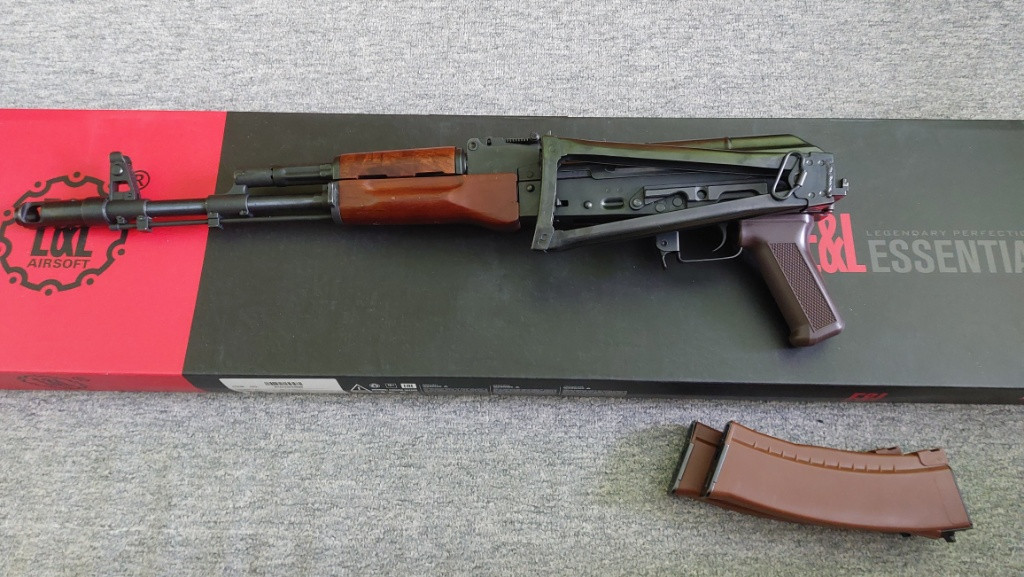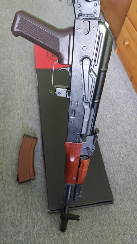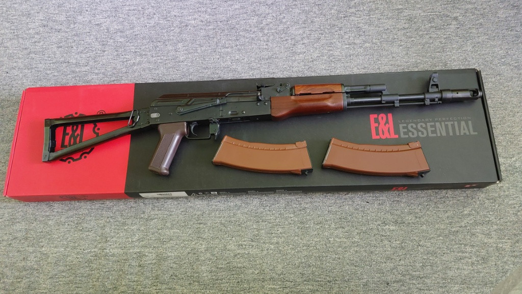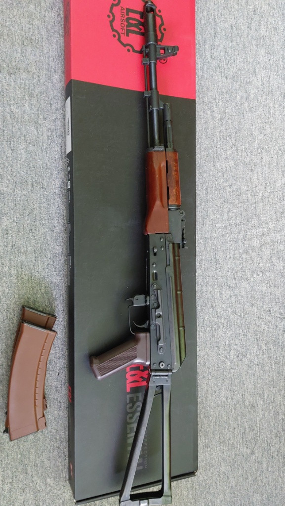 E&L Essential AKS-74N – celoocelové tělo, dřevěné díly, MOSFET, rychlovýměna pružiny. Zbraň vypadá velice realisticky, realistické je i sundání dřevěného pažbení. Tělo je vyrobeno z kvalitní ocele. Vnitřní díly jsou základ, ve zbrani je od výrobce instalován MOSFET a DeanT konektor na baterii. Ke zbrani přidám jednu Li-Po baterii 11,1V a 2 zásobníky. Někdy se stávalo, že při přepnutí z jednotlivých ran na dávku se zablokovala spoušť, pomohlo zajistit a znovu odjistit, jinak plně funkční. Zbraň byla na pár akcích. Moc jsem s ní nehrál a tudíž prodávám z důvodu nevyužití. Posílám přes zásilkovnu při platbě předem nebo na Dobírku. Cenu stanovuji pevně na 6000 Kč. + poštovné hradí kupující.