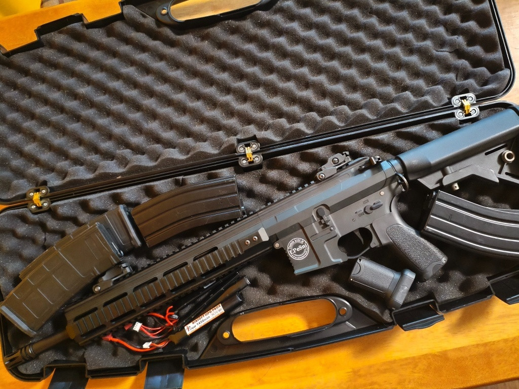 EPeSní GENERAL PAR Mk3 16,5" AEG - Delta Armory - ( nakoupeno 39990,- ) 2x zásobník tlačný + 3 zásobníky tlačné kovové , kufr + nová ( gumová ) patka na pažbu + Jednobodový poruh ( coyote ) + nahradni pruzina 110 nerozbalena na CQB . + taktický grip. + baterie 2x. ( Prošla pouze třemi akcemi, na horní ris liště je odřená v jednom místě po šroubu, jinak jako nová )