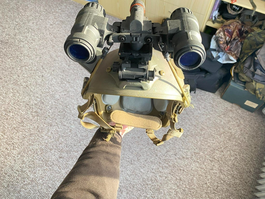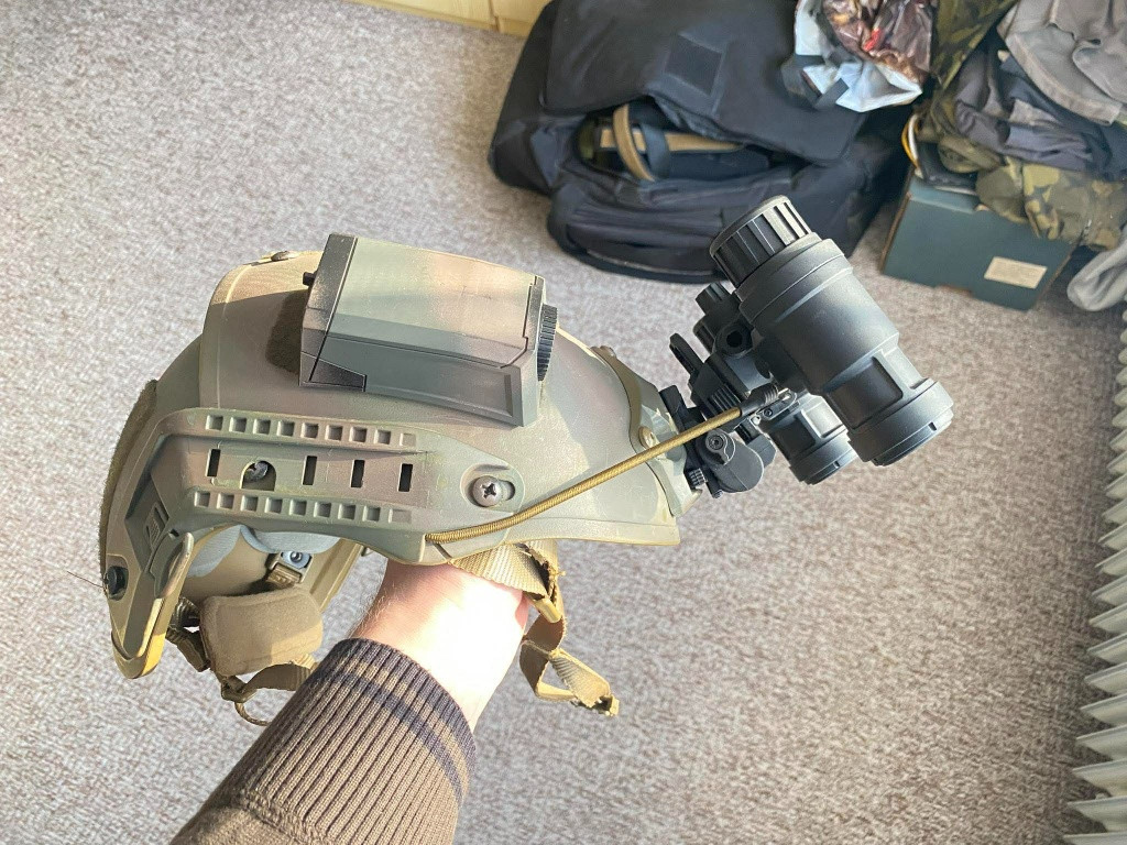 Prodám svojí Airframe od FMA velikosti L/XL. Helma je osazena plastovou montáží L4G24 od FMA, PVS 15 též FMA, atrapa kamery MOHOC od WoSport. Noční vidění je led verze