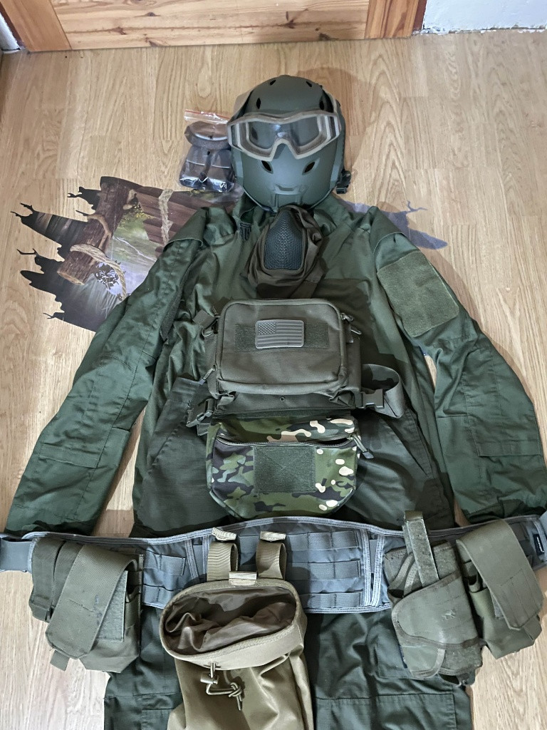 1 olive helma , maska s mřížkou , chestrig CUSTOM upravený s 2 malými kapsami pro malé zásobníky do SECONDARY , 3 velké kapsy pro dlouhé zásobníky , a 2 kapsy na zip pro další věci , olive opasek se 2 kapsami pro zásobniky , jedno pouzdro pro SECONDARY PISTOL , a 1 odhazovák barva KOJOT , 1 taktická olivová košile , olivové taktické kalhoty , taktické brýlé barva KOJOT + zdarma ostatní náhradní sklíčka