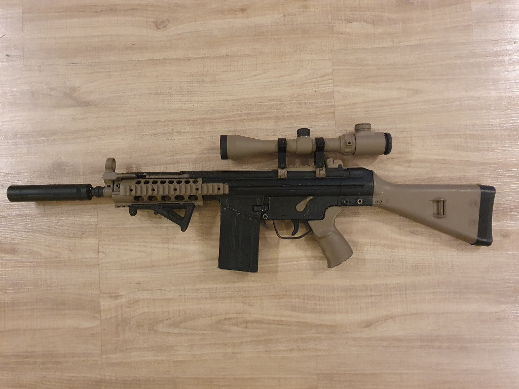 Ve zbraní je cnc mechabox první verze retoarms,nbu vzduch guarder, kola,trn ,píst shs ,motor elemen zátěžový ,přesná hlaveň, hop guma mapleleaf,mosfet. Optika přiblížení 6-12 podsvícený kříž červená-zelená. Kvér má nějaké neduhy ,pazbicka je z lct ,tak nedolehá, a byla zlomená pažba, vyztuženo plechy.
