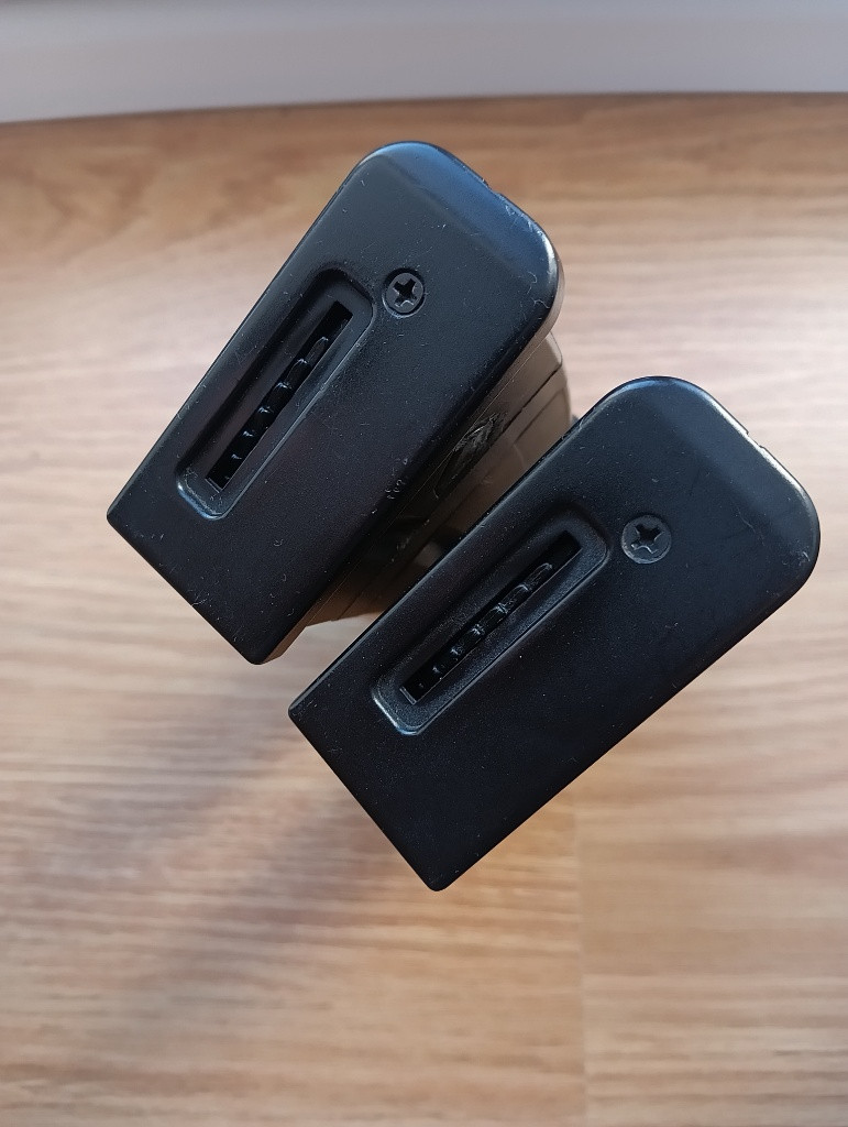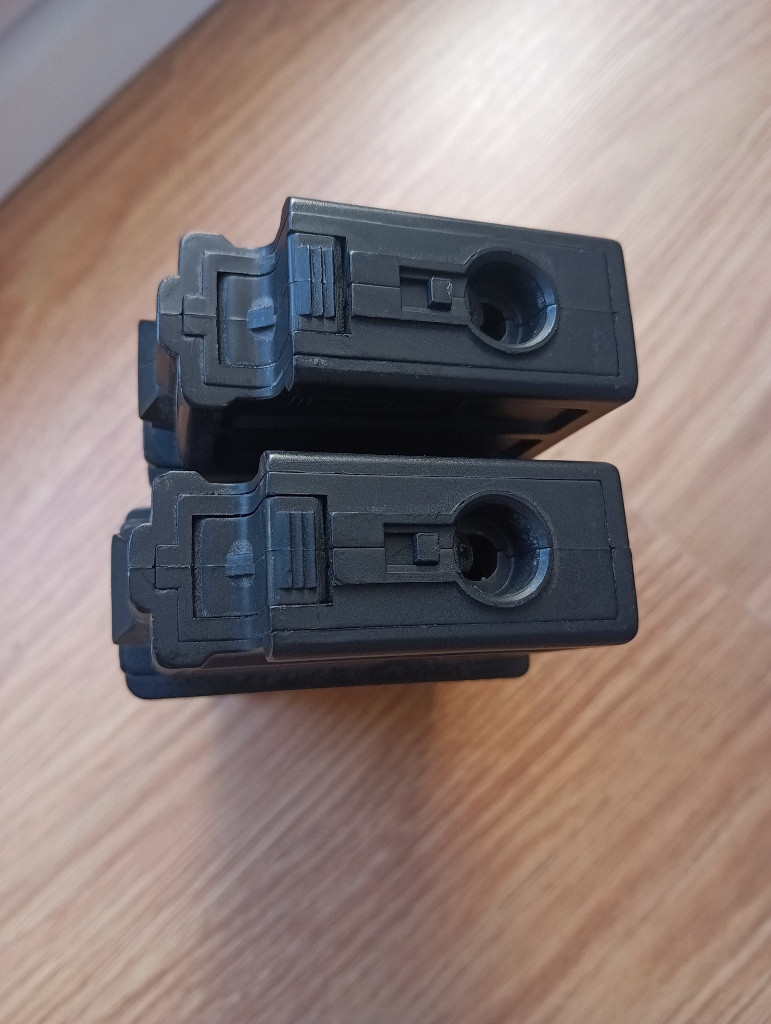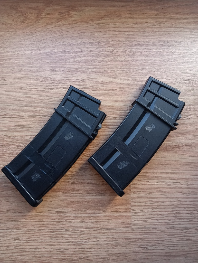 Dvojice točných zásobníků z balení JG G36. Bez poškození, mají odstraněné boční háčky, takže lépe pasují do sumek. Černé pásky byly přidané jen pro rozlišení.