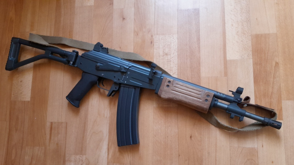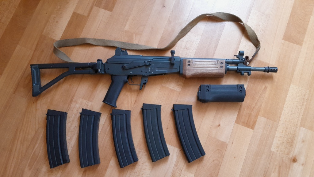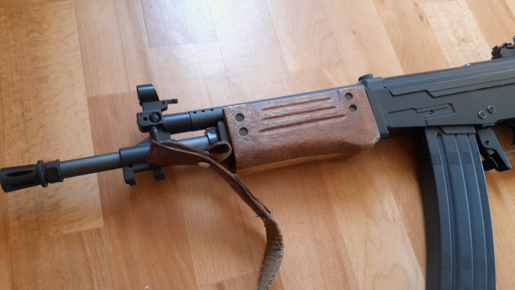 Prodám Galil SAR (Cyma) CM.043B Uvnitř: kola SHS 16:1, kuličková ložiska, píst SHS, hlava pístu AP, Válec SHS, hlava válce SHS, tryska Epes, hopup komora kopie Prowin, guma ML , mikromosfet Jefftron. Je tam dána nějaká slabší pružina tak aby to mělo cca 1,6J s 0.2g. Ke zbrani 4x Tlačák, 1xTočák a původní předpažbí, teď je na zbrani dřevěné. Po domluvě mohu ke zbrani přidat 11.1V nebo 7,4V baterii co se vejde pod kryt.