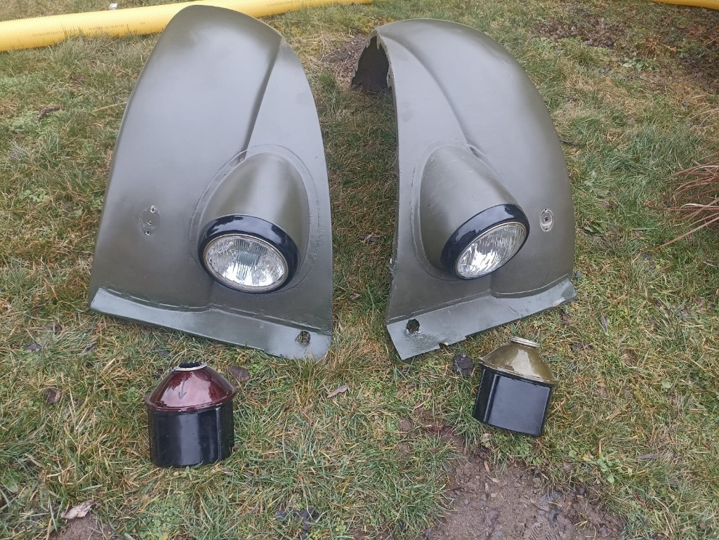 Prodám tyto díly 2x přední blatník se světlem a stínítkem (4000kč kus). Blatníky jsou sundaná z auta. Nepomačkané, opískované, vrchní barva ral 6014 polomat. První mezityp kapoty s G . Opískovaná, pěkná. vrchní barva ral 6014 polomat. ( Cena 9000kč) První typ tlumiče výfuku, sundán z auta, nepoškozený (cena 2000kč ) Osobní odběr dílů