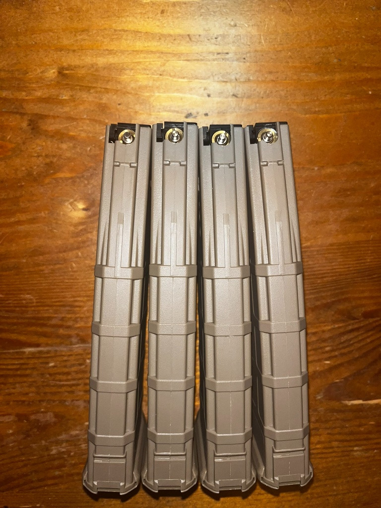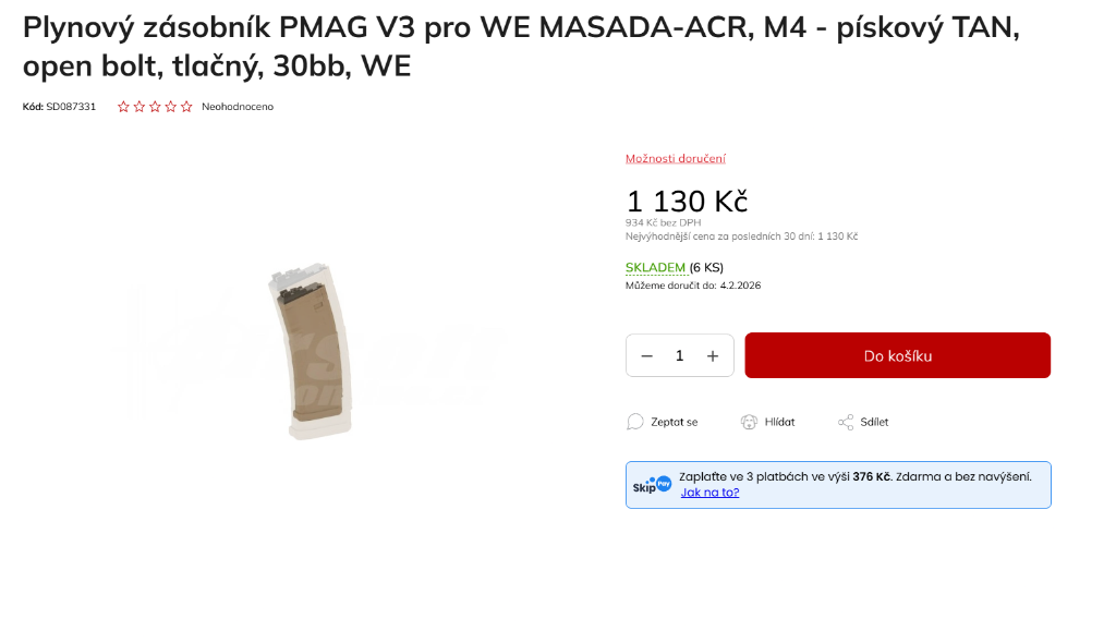 4x WE Pmagy, 30bb, tan. Nepoužitý, kupovaný 16.1.2026. Prodávám z důvodu koupě špatných zásobníků. Cena za všechny. Posílám zásilkovnou nebo možný osobní odběr v Mladé Boleslavi. Pro kontaktování pište SMS.