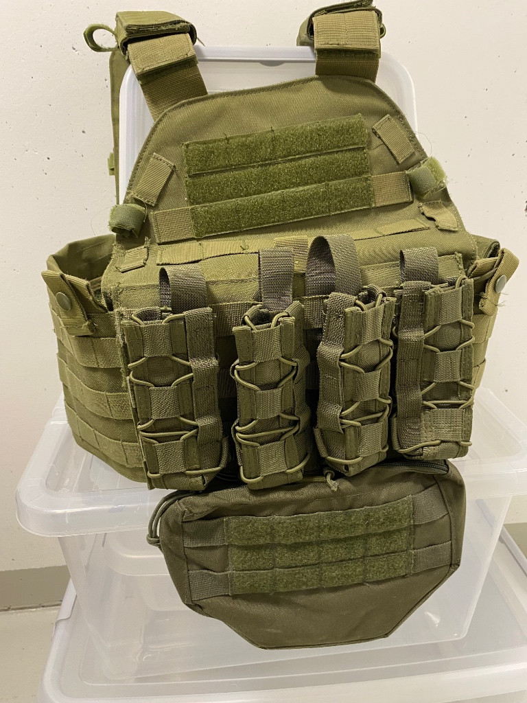 Prodám vestu od značky Gfc Tactical v barvě oliva. Se třemi sumkami na smg. K tomu přidám břišní sumku. Uvnitř vesty jsou ze stran suché zipy do kterých můžete dát třeba vysílačku. Posílám přes zásilkovnu.