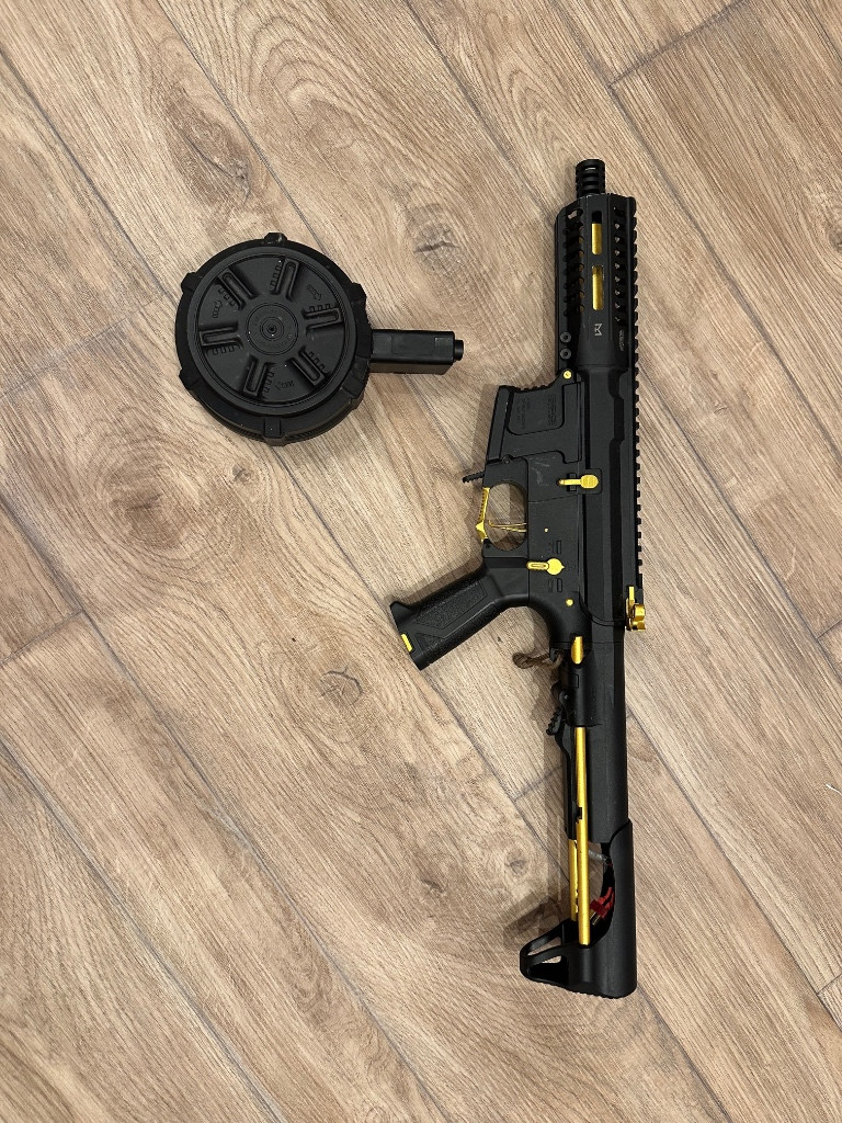 Zdravím, prodám Arp od G&G ve zbrani je píst s celokov zuby, tryska shs, hlava válce shs, pružina retro arms 120 zbytek zbraně pěkný základ :) ke zbrani přidám originál G&G buben. Na 0,25g 97m/s 1,17j zbraň má krásný zvuk a rychlou odezvu na spoušť předání možné Plzeň po domluvě Praha. Platí do smazání ( výměna je možná za zbraně typu AK )