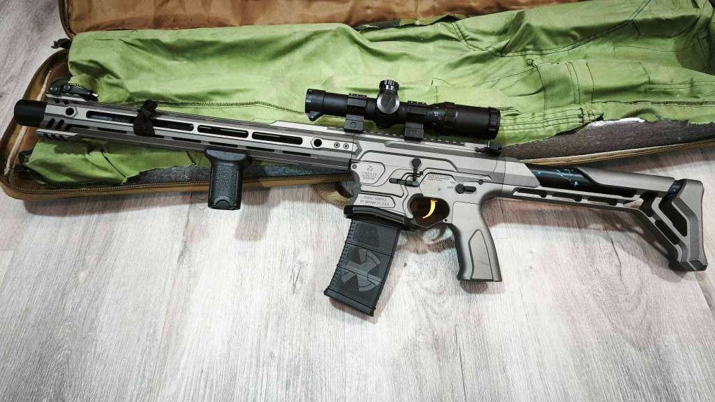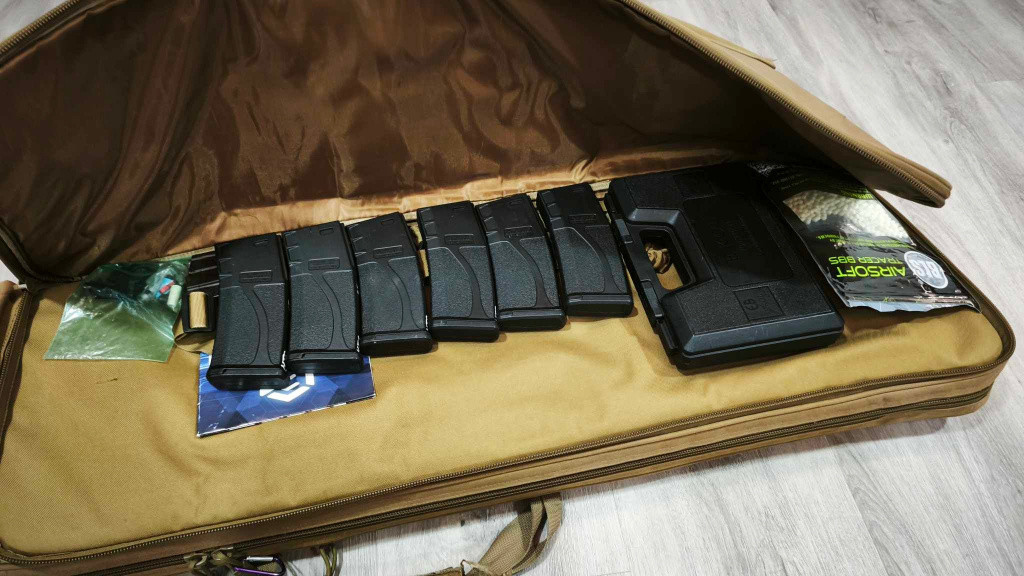 Zbraň v lehkém upu (už si nepomatuji co přesně), CNC tělo je v šedém odstínu, spoušť je eloxována ve zlaté barvě, všechny díly zbraně jsou kovové (s výjimkou výhozího okénka). Tedy i díly, které jsou běžně z plastu, jako např. pažbička či pažba. Na těle zbraně naleznete kromě sériového čísla také ražení výrobce. 70% zesílení skeletu mechaboxu v nejnamáhanějších místech * Rychlá výměna pružiny (quick change spring) Dvojité těsnění na hlavě válce a trysce pro vyšší výkon Oboustranný přepínač střelby i uvolnění zásobníku pro rychlejší obsluhu Odpojení motoru v případě nezaloženého nebo prázdného zásobníku Vylepšená šikmá ozubená kola pro vyšší výkon, nižší zahřívání a spotřebu elektřiny. Ke zbrani 1x originální zasobník a 6x guarder tlačný zásobník, tělo je celokovové bez sebemenší vůle (nikdy jsem neměl kvalitnější tělo v ruce) na zbrani je zapuštěný tlumiš a grip na předpažbí, optika strike systems 1-4 x 24 která stojí 3tis, ke zbrani vše co je na fotce https://www.anareus.cz/cs/optiky-puskohledy-a-lpvo/11275-optika-1-4-x-24-s-montkrouzky-s-podsvicenim-krize-STRIKE070.html